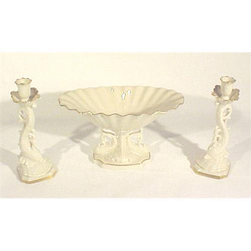 It really does look just like Belleek! The luster is so rich & the karat gold detailing is superb marked with the wreath, the condition is perfect; the scalloped top oval center bowl is 12" x 6 3/4' h. The elegant dolphin candlesticks are 10" high there is so much fine detailing that the camera just cant capture, If you like this 3 piece set in the pics you will be 100% delighted to see them in real life, real low reserve, thanks search Lenox American Belleek dolphins dolphin candlesticks centerpiece compote