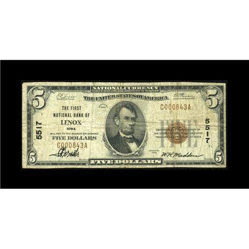 <B>Lenox, IA</B></I> - $5 1929 Ty. 1 <B>The First NB</B></I> Ch. # 5517<BR>An easily available bank in large size, but considerably scarcer in small, with the census showing only seven such examples. <B>Fine.</B></I>
