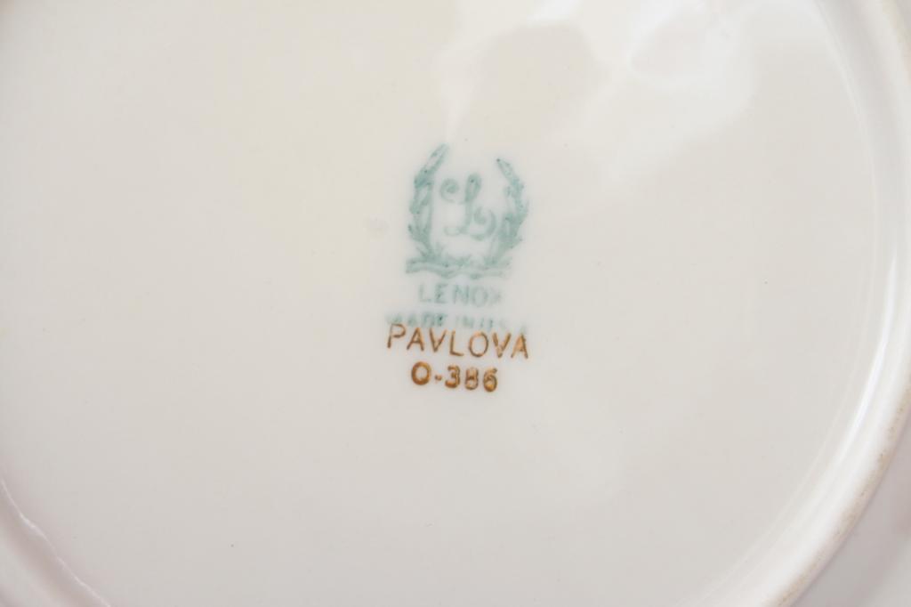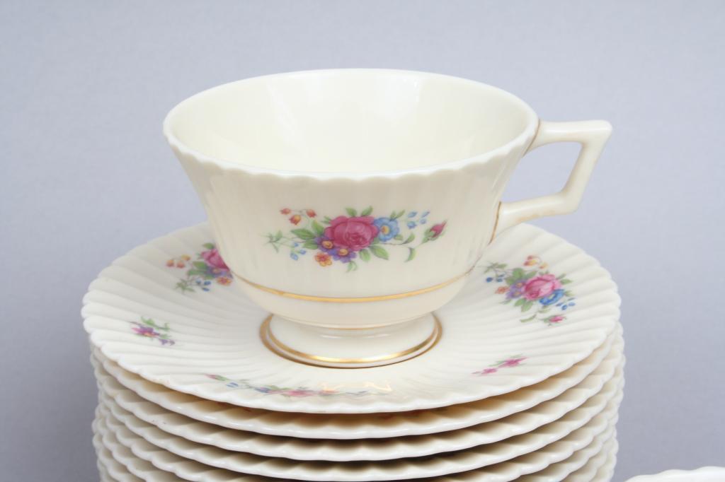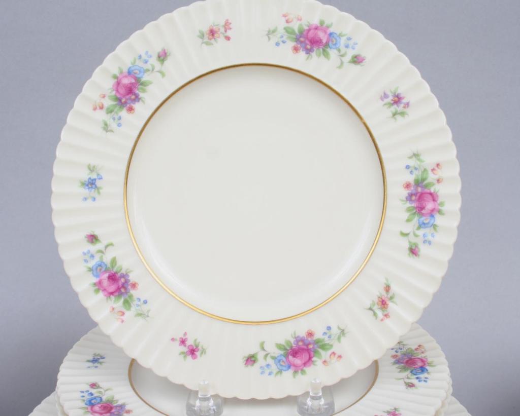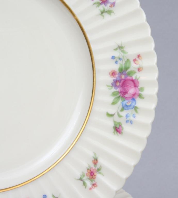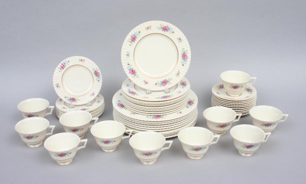 Lenox, comprising eight dinner plates (10 3/4"D), eight dessert plates (8 1/2"D), eight bread plates (6 1/4"D), and eight tea cups and saucers (cup 2 1/2"H. saucer 5 3/4"D), each with ribbed rims, decorated with polychrome floral sprays, the details gilt, the verso stamped with company logo and pattern name. Condition: one cup chipped and cracked, otherwise excellent.