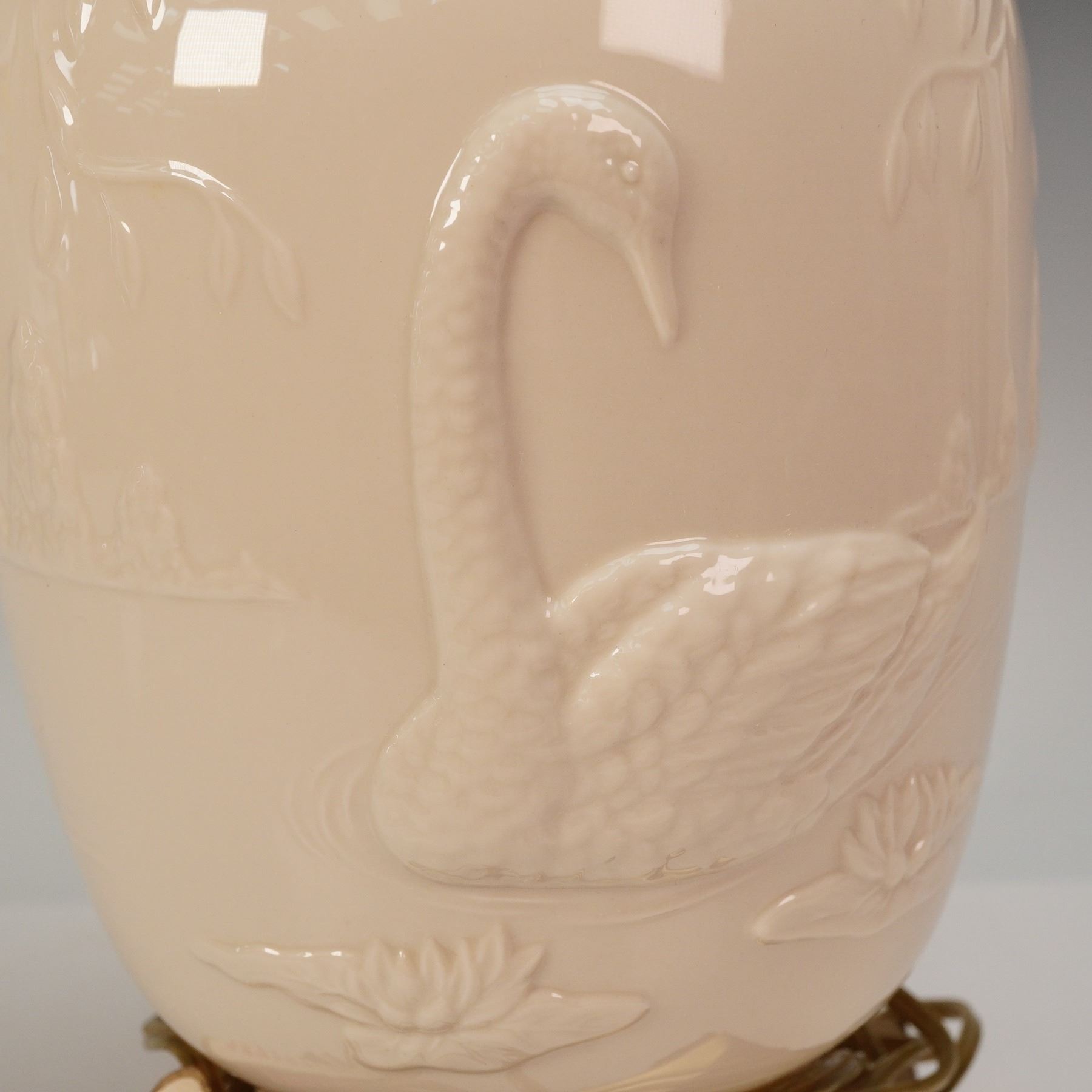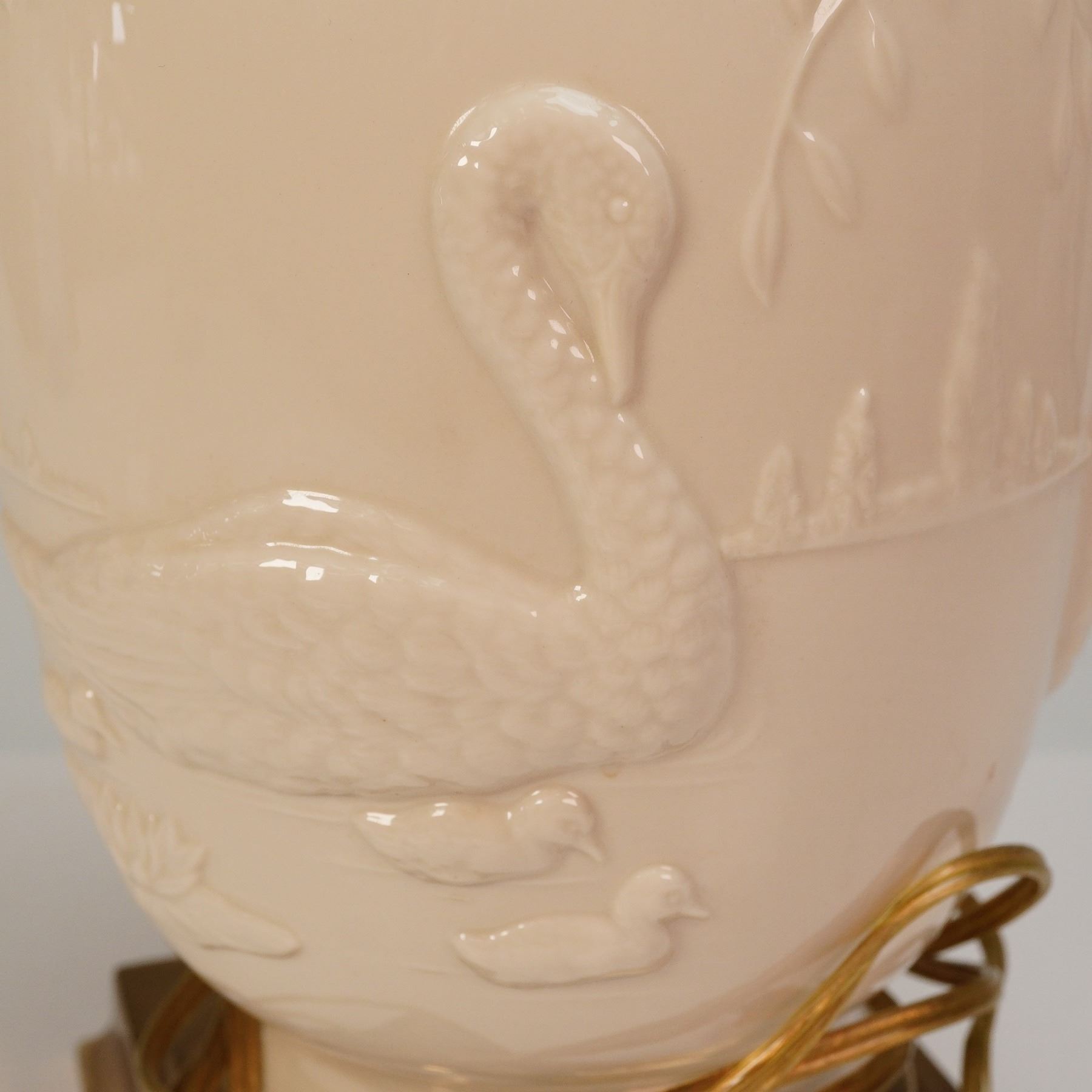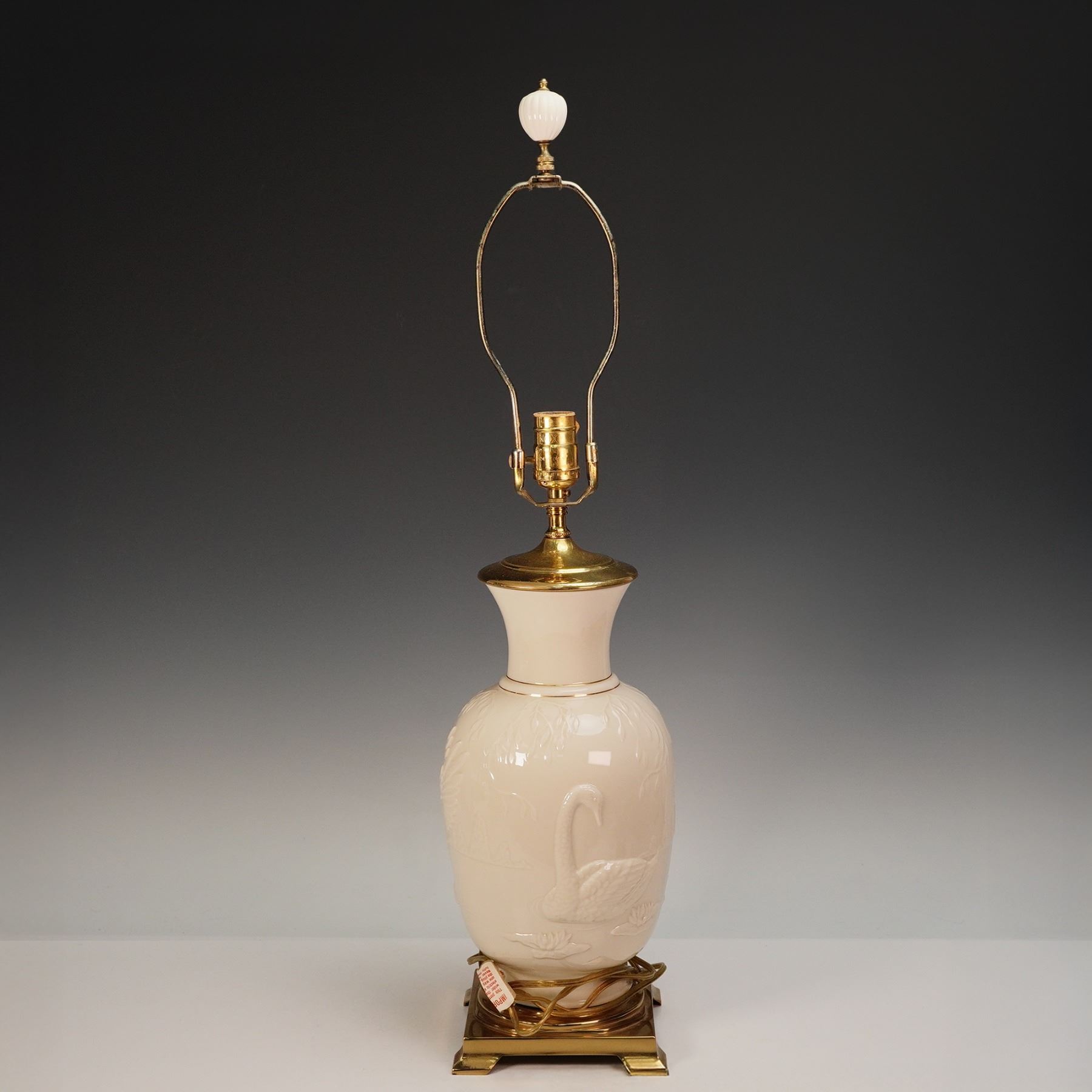 Appealing porcelain lamp from the esteemed Tracery Collection. The lamp's baluster form body is rendered in a cream hue, adorned with delicate vertical ribbing and encircled by an intricate pierced tracery collar. The piece is crowned with a tailored pleated ivory fabric shade and framed in brass hardware. Lenox backstamp.