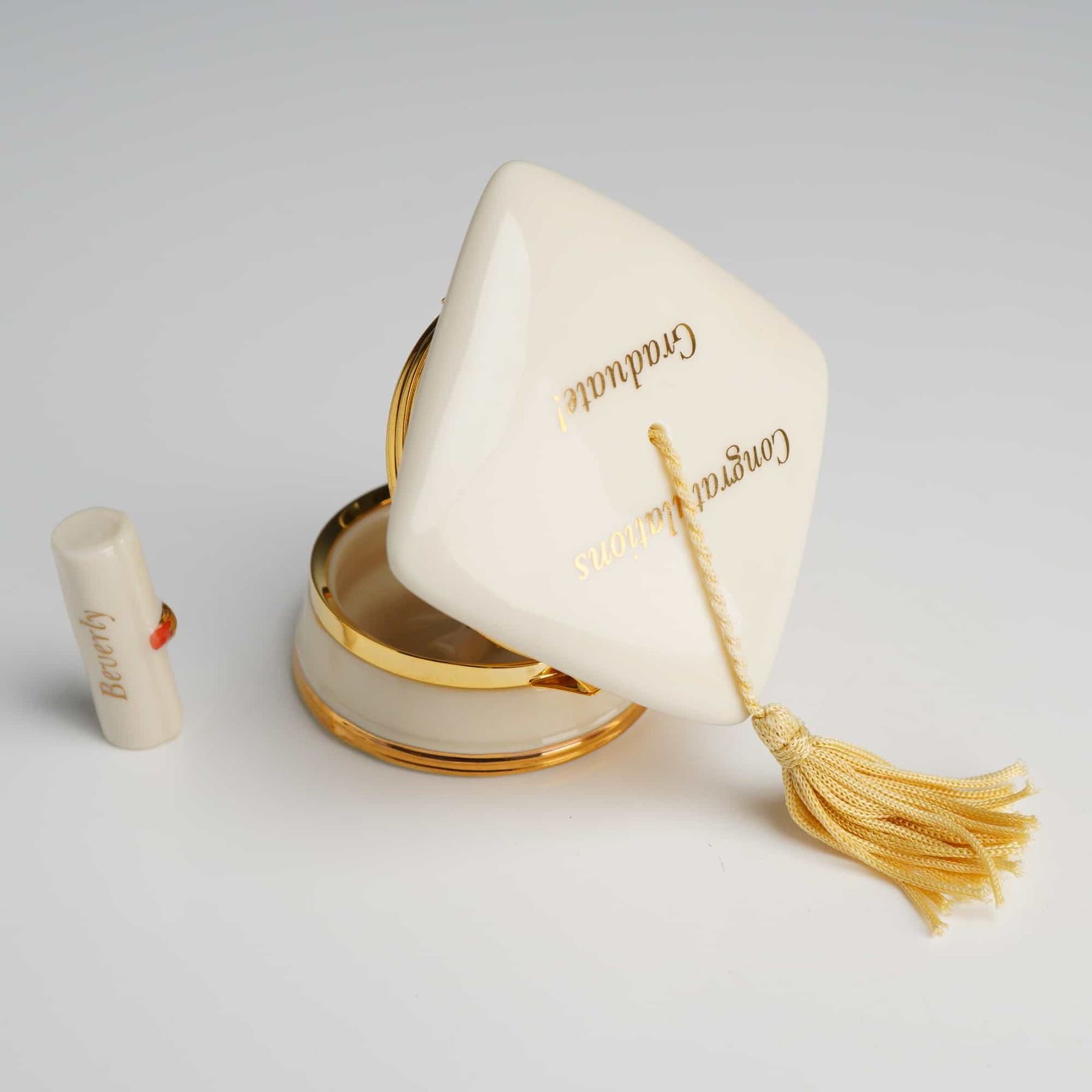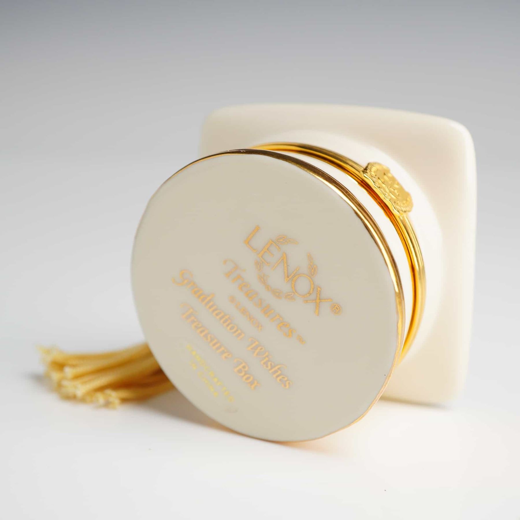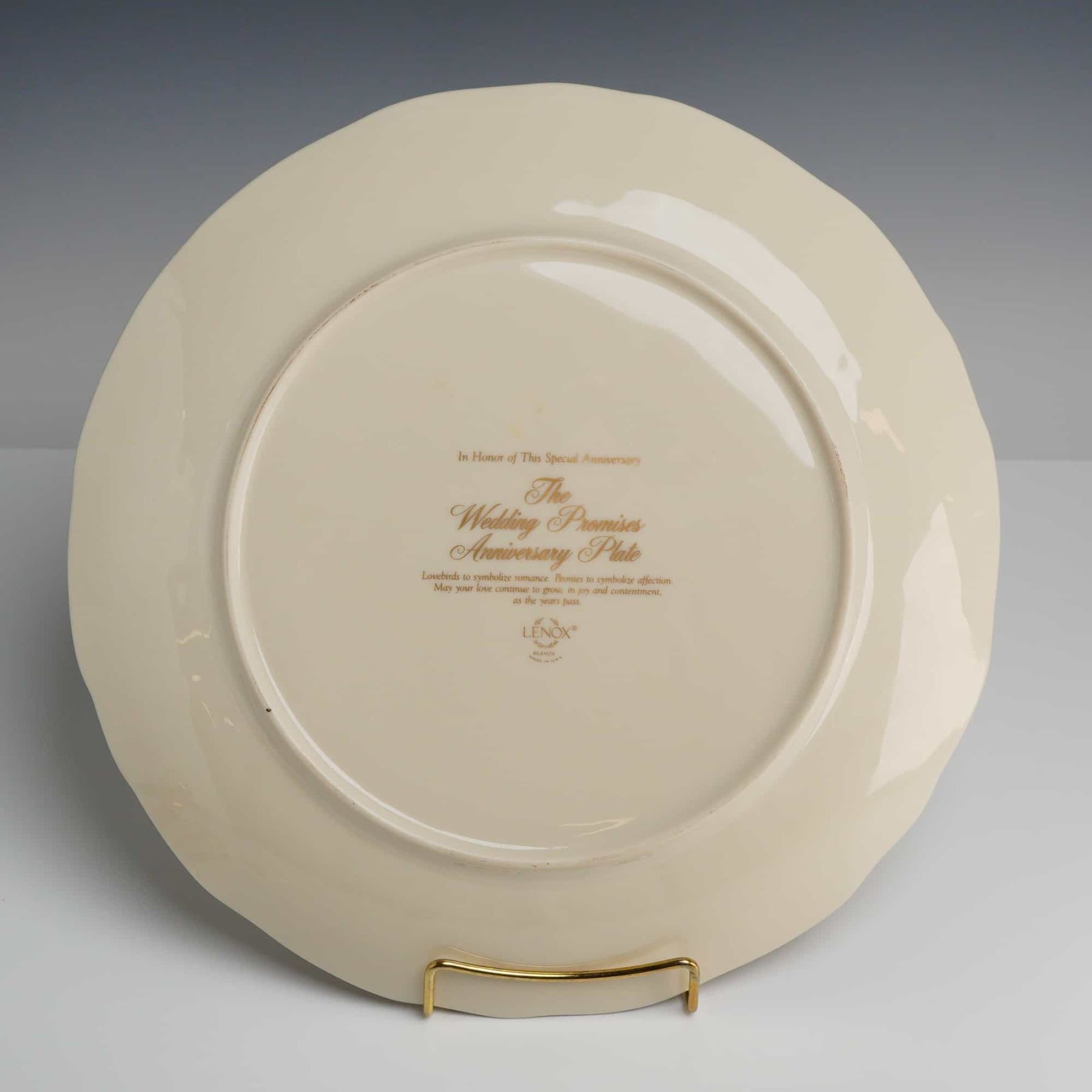 A pair of commemorative ivory-toned porcelain items from Lenox. This lot features a 2pc Lenox The Wedding Promise Plate and a Lenox treasure box. The first item is a large circular display plate from the Wedding Promises collection, featuring a wavy, scalloped rim and an elegant relief-molded central motif of two lovebirds perched among floral sprays. The wide rim is decorated with embossed acanthus leaf scrolls and floral bouquets, finished with a fine platinum-colored trim. The reverse is marked in gold: In Honor of This Special Anniversary, The Wedding Promises Anniversary Plate, Lovebirds to symbolize romance, Peonies to symbolize affection, May your love continue to grow in joy and contentment as the years pass, LENOX. The second item is a Lenox Treasures Graduation Wishes treasure box modeled in the shape of a graduation mortarboard cap. The lid features hand-applied gold-tone script reading Congratulations Graduate! and is adorned with a yellow fabric tassel. The box is joined by a gold-tone metal hinge and clasp. Included is a separate miniature porcelain diploma scroll accessory with a red seal, personalized with the name Beverly in gold script. The base is marked: LENOX Treasures, Graduation Wishes Treasure Box. Weight includes all items. Measurement is for largest item. Diameter 12.5 inches.
