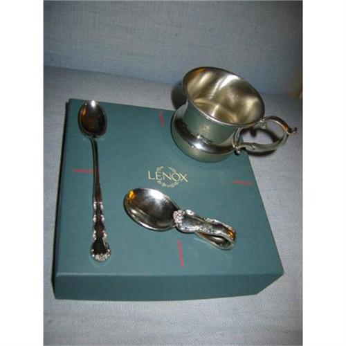 collectible and functional lenox pewter U.S.A. Baby feedign set. two spoon one small and other large with a cup all made with pewter. nice memorablia for a baby to grow . it has its original box 6.5 " square. cup 2.5 inch tall-3.5 inch wide and 3 inch deep. spoons are 5.5 - 3.5 both in great condition. only cup has a mark of Lenox Pewter with original lenox olive wreath. blue box has one imperfection on the side. something to think about!