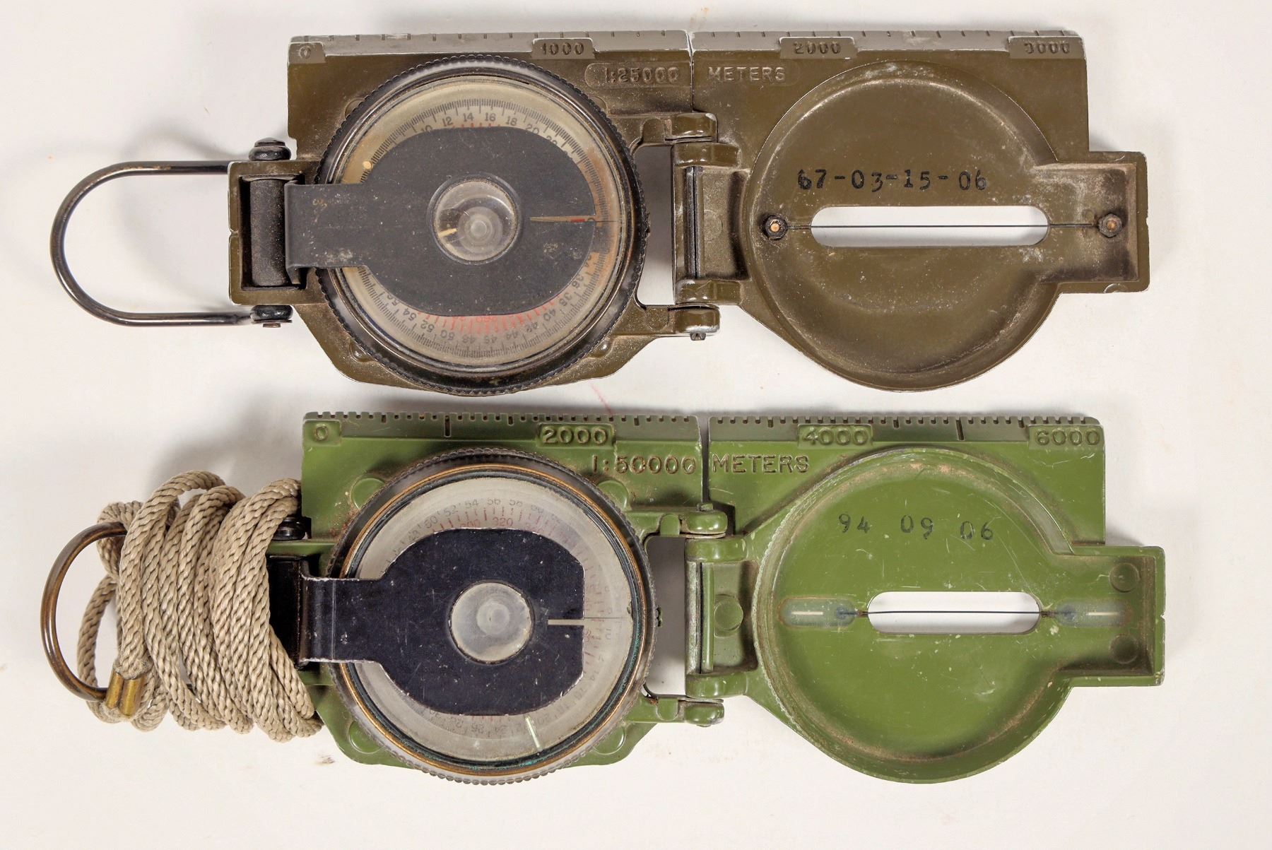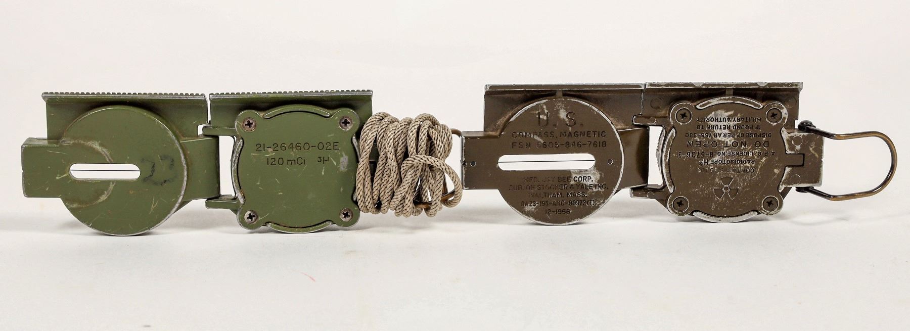 There are two compasses in this group. A Jay Bee Co. lensatic field compass dated 12-1966/ U.S. /magnetic compass/FSN 6605-846-7618. The second compass is a Cammenga Tritium compass #21-26460-02E inside cover 94 09 06 with a cloudy lens. From the Popovich collection. Please see photos for details.