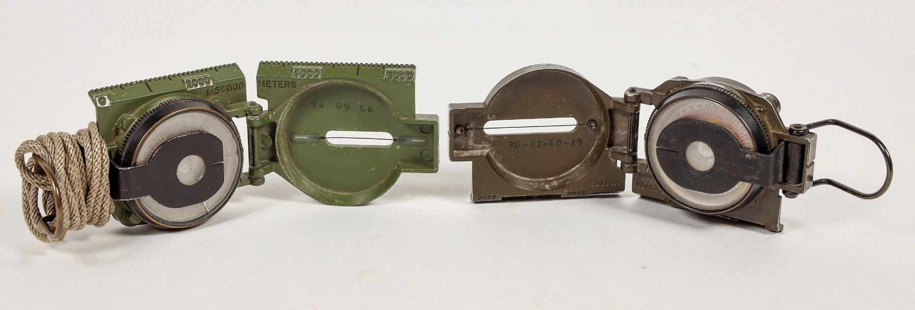 There are two compasses in this group. A Jay Bee Co. lensatic field compass dated 12-1966/ U.S. /magnetic compass/FSN 6605-846-7618. The second compass is a Cammenga Tritium compass #21-26460-02E inside cover 94 09 06 with a cloudy lens. From the Popovich collection. Please see photos for details.