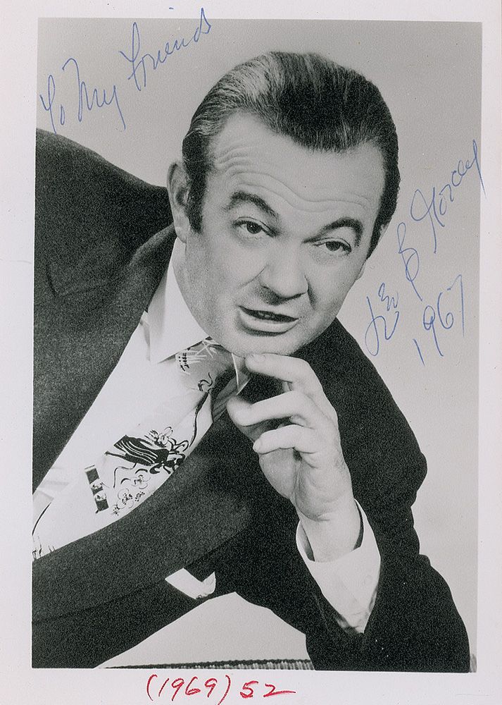 Matte-finish 5 x 7 photo, signed and inscribed in blue ballpoint “To my friend, Leo B. Gorcey 1967.” In fine condition, with red ink notation to bottom border.