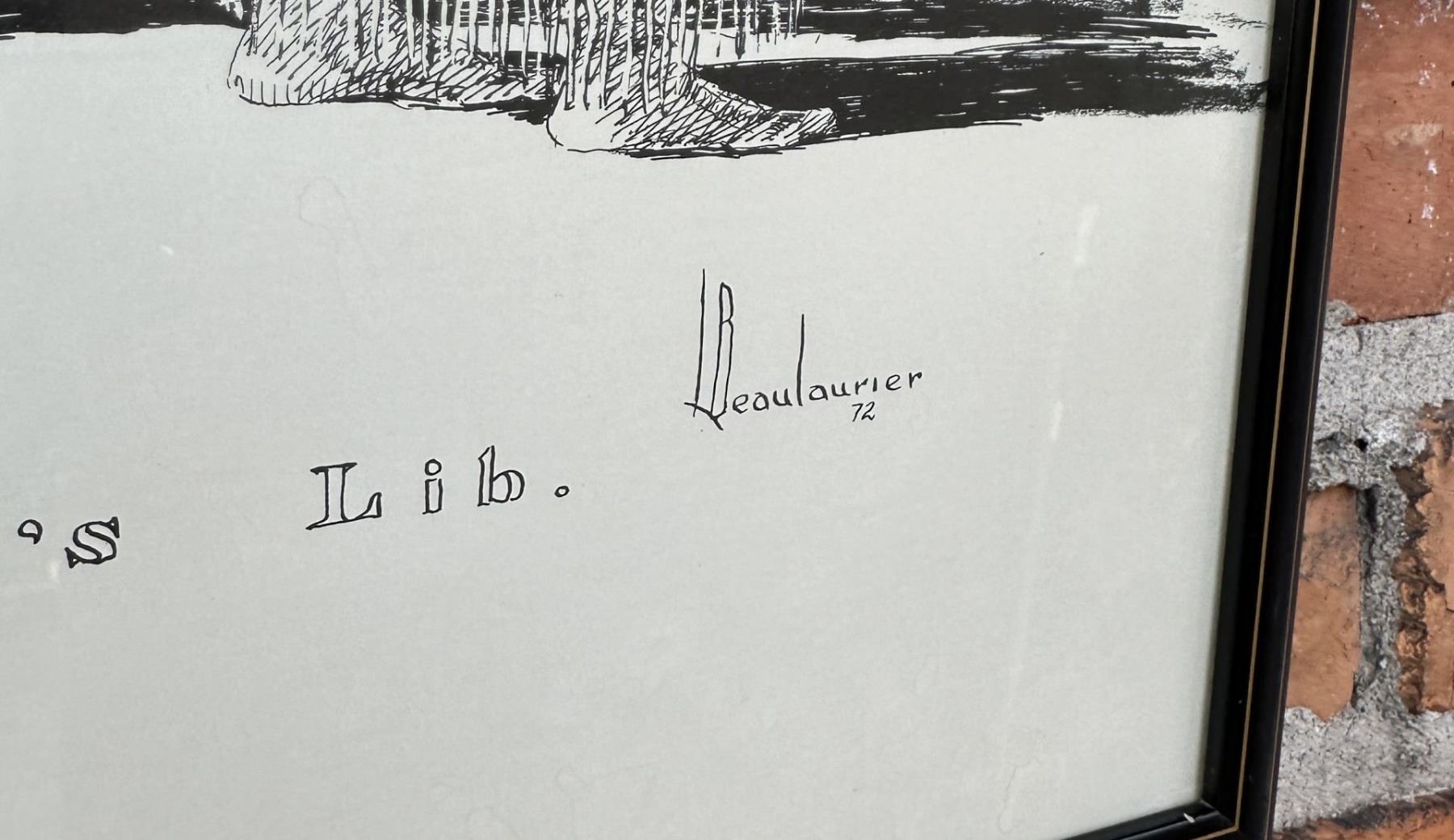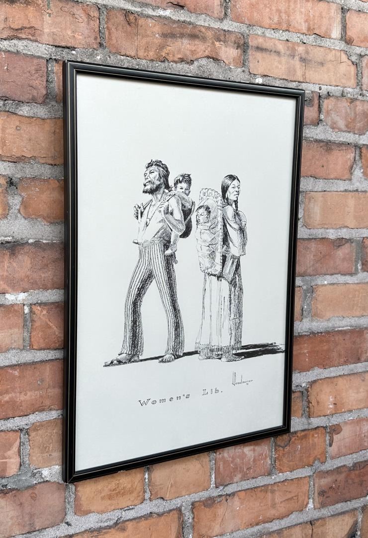 Pen and Ink on Paper. Title is Women's Lib. 13 3/4" by 19 3/4" framed. Leo James Beaulaurier (1911 - 1984) was active/lived in Montana. Leo Beaulaurier is known for Indian portrait, illustrator, mural. Born in Great Falls, Montana, Leo Beaulaurier captured history with his portraits of Native Americans on black velvet, and his murals are in various post offices around the country. He studied at the University of Notre Dame and the Art Center School in Los Angeles. He was active in the art community of Great Falls where he exhibited at the State Fair and local exhibitions.