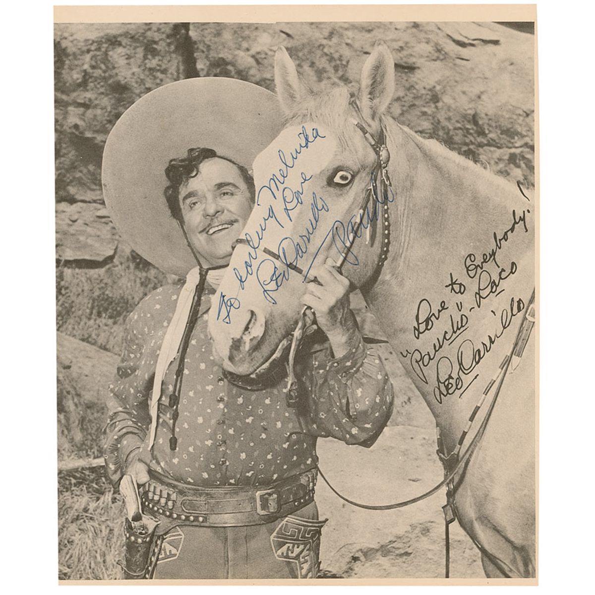 Cardstock 8 x 9.5 photo of Carrillo as Pancho, signed and inscribed in blue ballpoint “To darling Melinda, Love, Leo Carrillo.” Photo also bears a pre-printed signature and sentiment. In fine condition, with lightly trimmed edges.