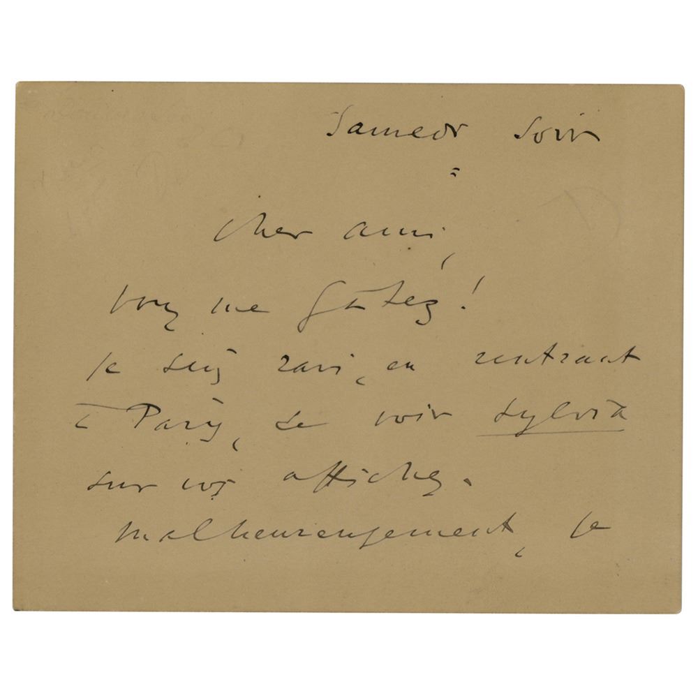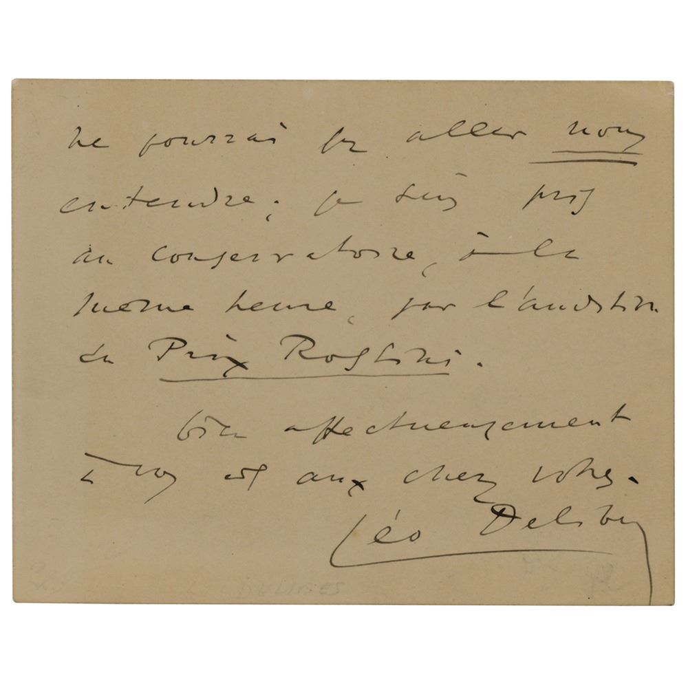 Notable French composer of ballets and operas (1836-1891). ALS in French, one page both sides, 4.5 x 3.5, no date. Handwritten letter to painter and lithographer Jules Cheret, who created the sumptuous sets for 'Sylvia,' as well as posters for 'Sylvia' and 'Coppélia.' In part (translated): "You’re spoiling me! Upon my return to Paris I’m delighted to see Sylvia on your posters. Unfortunately I won’t be able to go and hear us [Delibes underlines twice]; I have to be at the Conservatory at the same time for the Prix Rossini auditions." In fine condition.