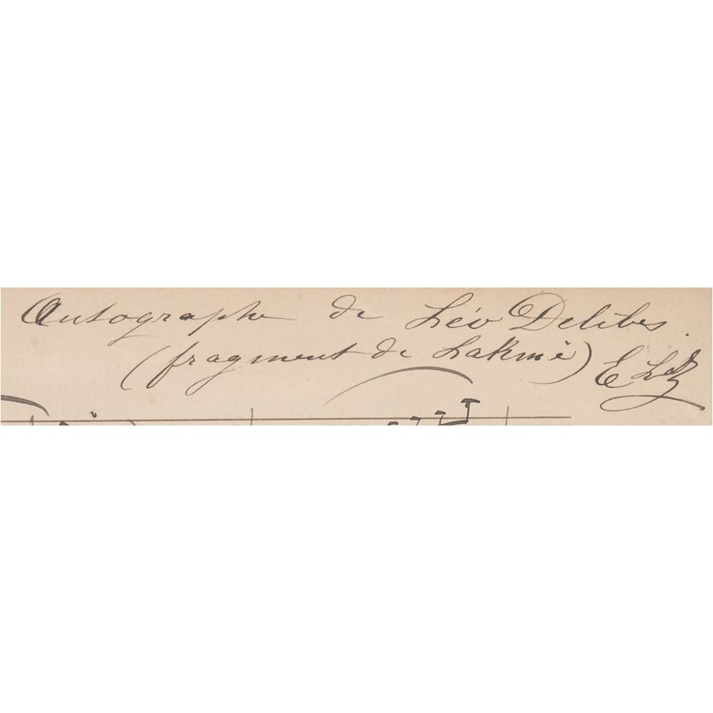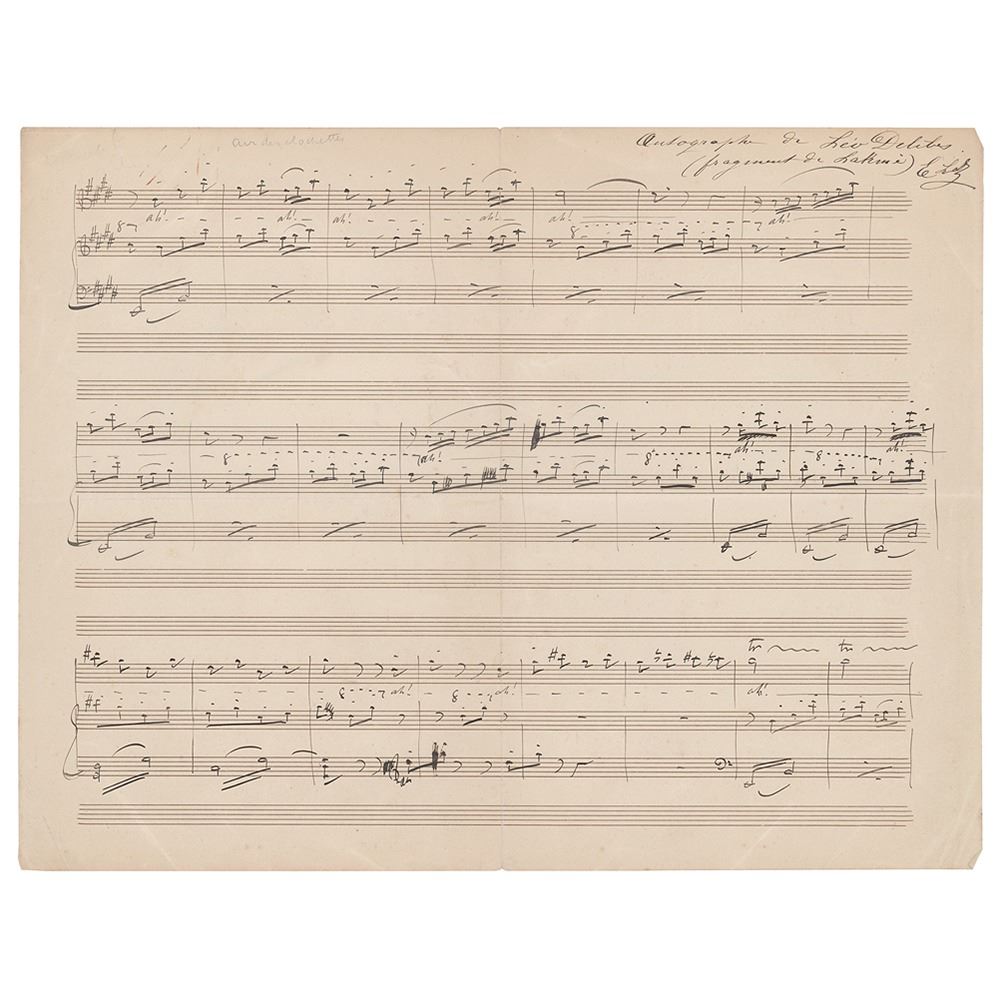 Superb partial unsigned handwritten musical manuscript by Delibes, one page, 13.75 x 10.5, no date. Delibes pens 24 bars from 'L'Air des clochettes' (The Bell Song) the most famous aria from his 1883 opera Lakm̩. An identification notation is penned in the upper right in the hand of his wife. In very good to fine condition, with scattered creasing, and intersecting folds. A precious musical manuscript, comprising the most famous part from his most famous work.