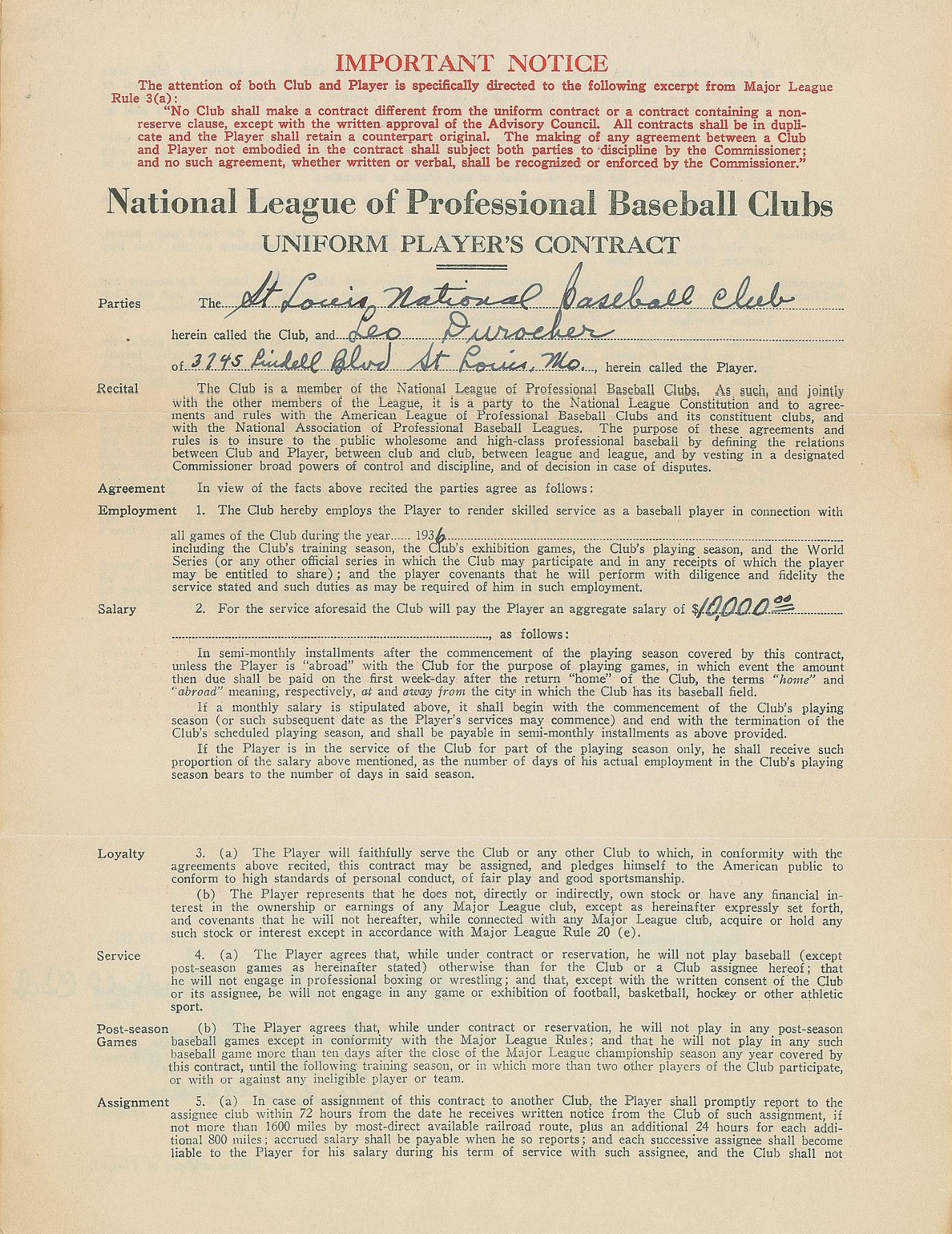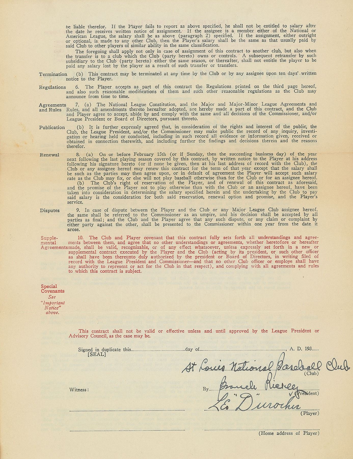 Contract, signed “Leo Durocher” and “Branch Rickey,” four pages on two adjoining sheets, 8.5 x 11, [1936]. National League uniform player's contract in which Leo Durocher agrees to render "skilled service as a baseball player in connection with all games of the Club during the year 1936" for the St. Louis Cardinals, for an aggregate salary of $10,000 per season. Signed at the conclusion in fountain pen by both Durocher and Rickey, who adds “St. Louis National Baseball Club.” In fine condition, with a band of toning to back pages, in no way affecting writing or signatures.