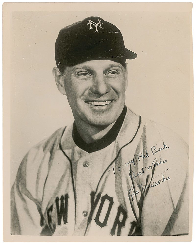 Vintage glossy 8 x 10 head-and-shoulders photo of Durocher in his Giants uniform, signed and inscribed in fountain pen, “To my pal Buck, Best Wishes, Leo Durocher.” Scattered surface bends and creases, and a slight brush to the signature, otherwise fine condition.
