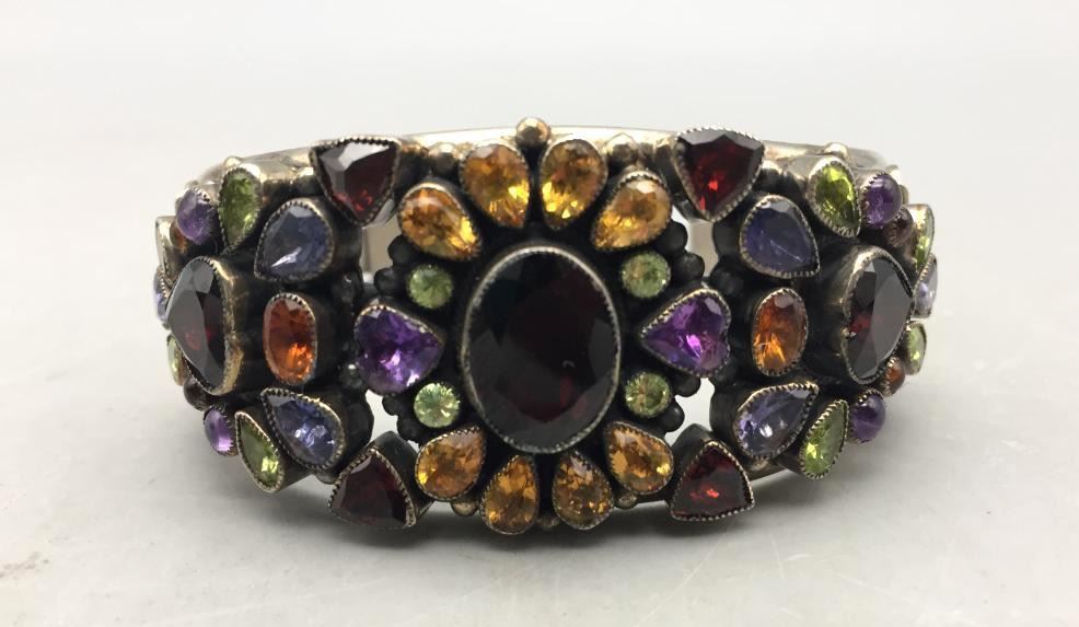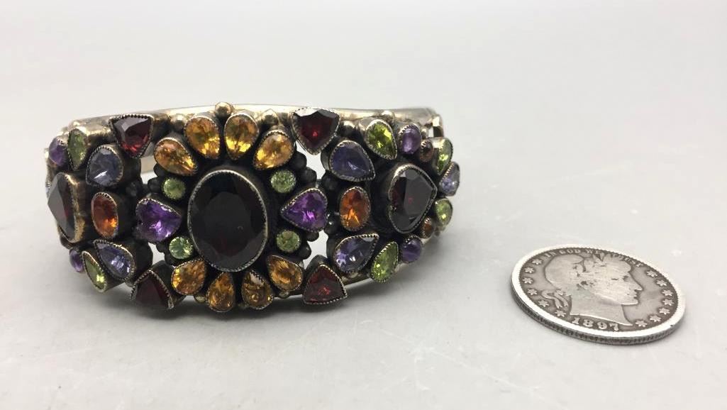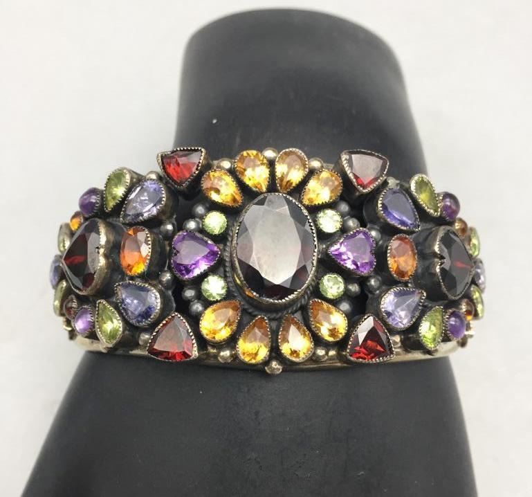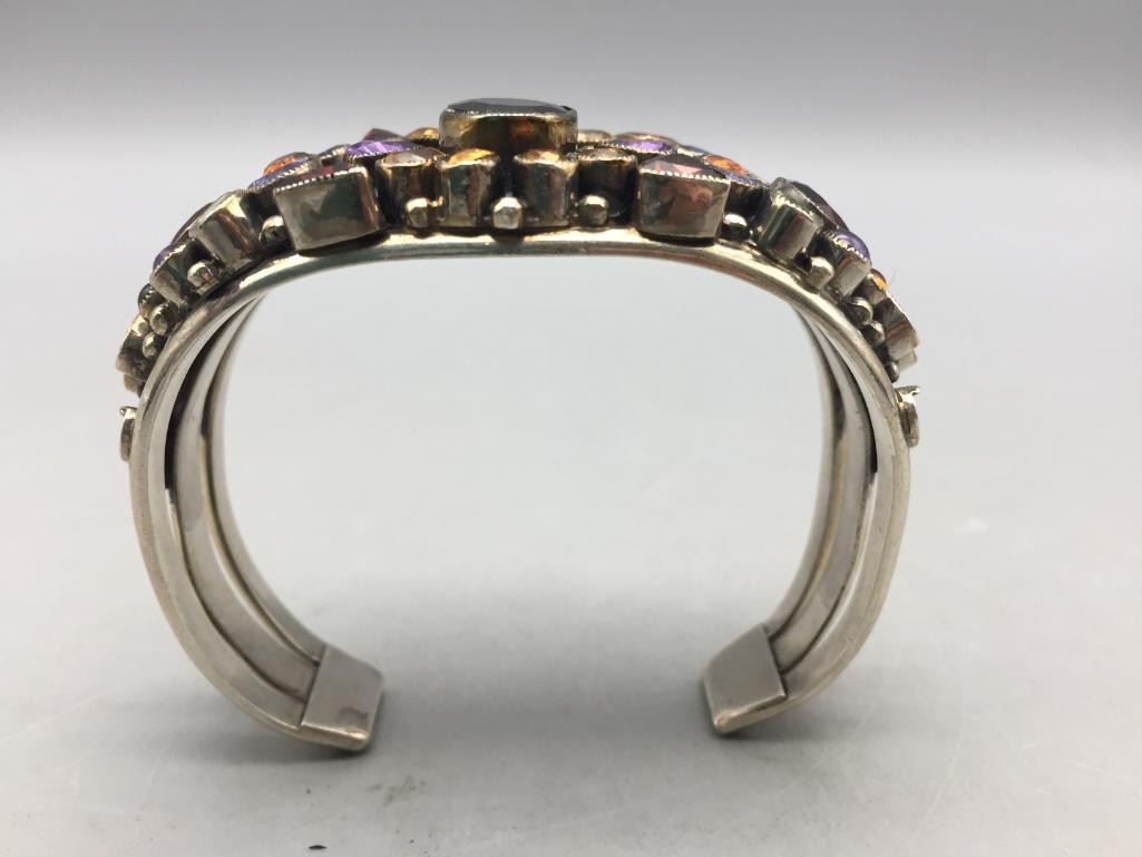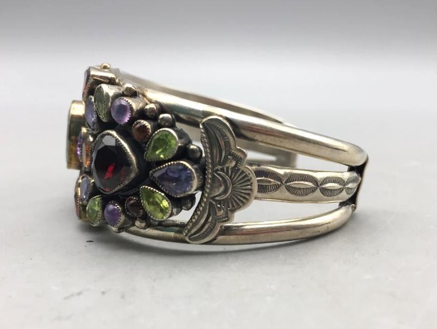 Offered for sale in this lot is this jeweled cuff by Leo Feeney. This bracelet is set with a variety of semi precious stones, giving it a great dazzling look. Marked as sterling. Maker: Leo Feeney (Anglo) Active since ca.1970s. Approx. Age: Fairly modern. Size: Inside circumference measures 5-1/2". Opening is additional 1-1/4", fitting a 6-3/4" wrist. Width is 1-1/4". weighs 58.5 grams. Condition: Good for its age, normal wear expected. Please look closely at the pictures - they are an important part of our description. Shipping: There will be a $5 handling, packaging fee for shipping this lot. The actual cost of postage will be added on top of that.