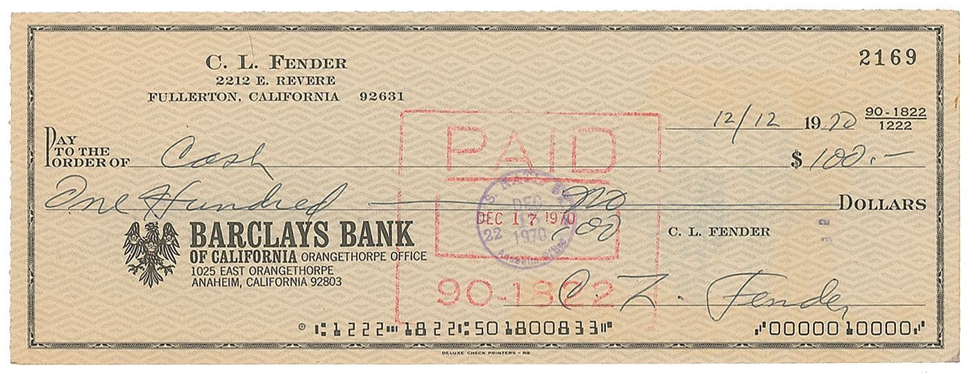 Personal check, 8.25 x 3, filled out and signed by Fender, "C. L. Fender," payable to cash for $100, December 12, 1970. In fine condition.