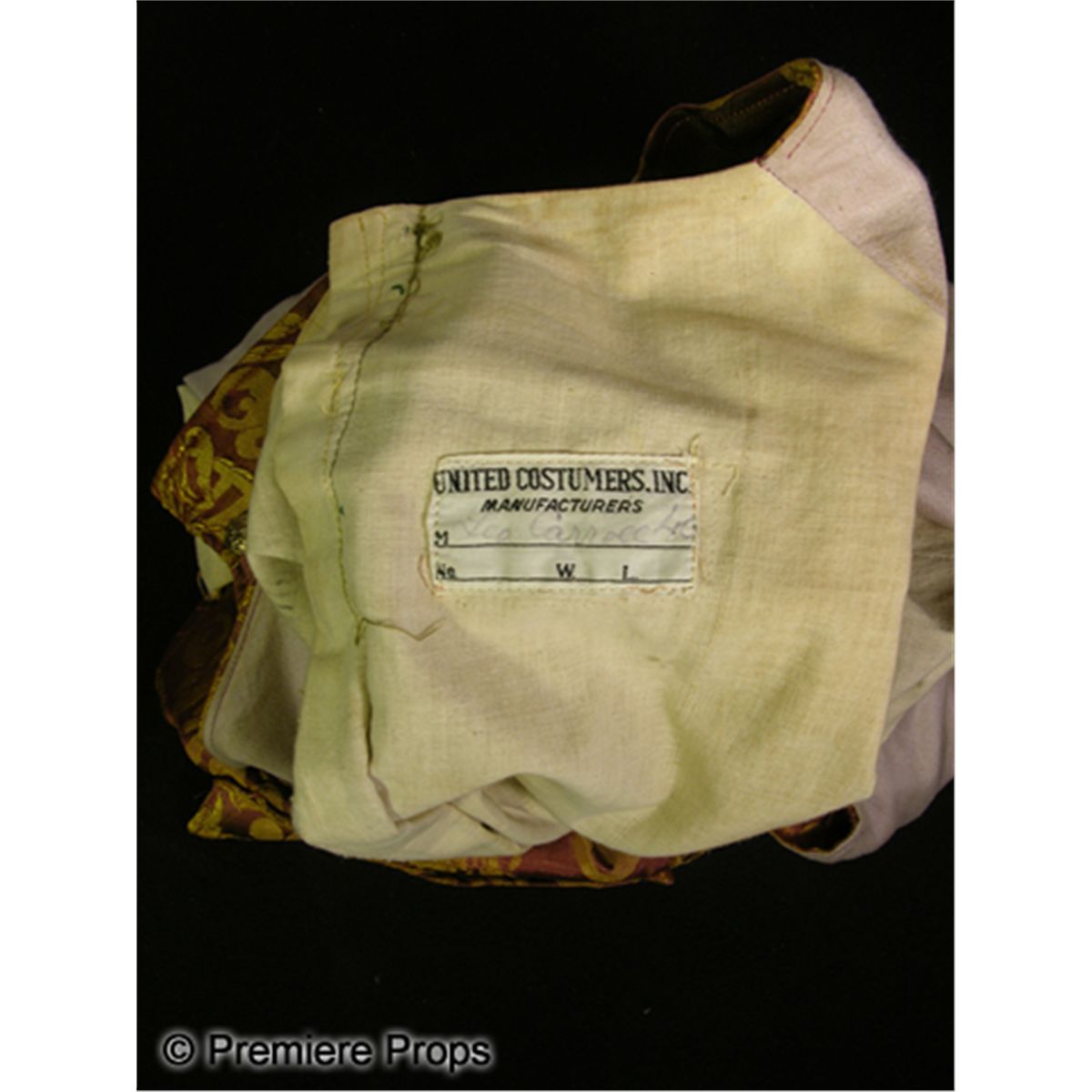 Burgundy vest with gold floral motif, worn by Leo G. Carroll in Clive of India (1935). The British born actor appeared in such films as The Desert Fox, Father of the Bride and, most famously, on television as Alexander Waverley, the head of the U.N.C.L.E. agency on The Man From U.N.C.L.E. Includes a United Costumers label on the inner lining with Carroll's name handwritten on it.