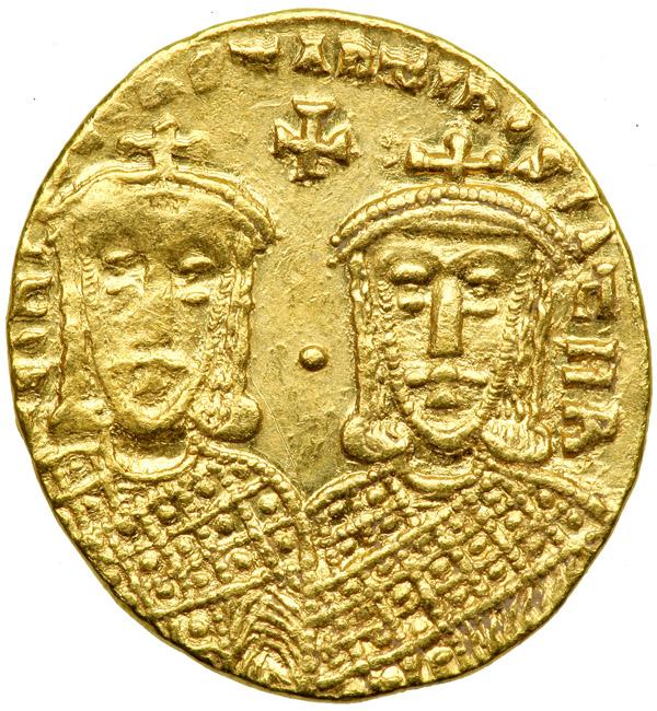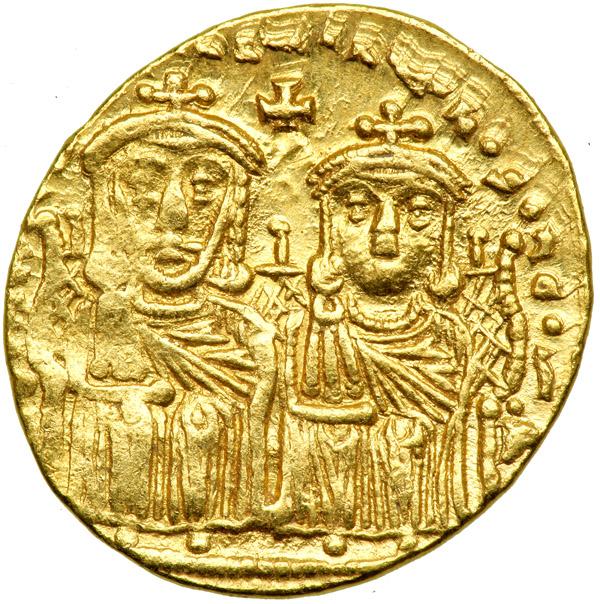 Leo IV, 775-780. Gold Solidus (4.46 g) minted at Constantinople. Leo IV and Constantine VI (son of Leo IV) enthroned, facing; in upper central field, cross. Reverse: Busts facing of Leo III (grandfather of Leo IV) and Constantine V (father of Leo IV); in upper central field, cross. D.O. 2; S. 1584. Rare. Matching weakly struck areas on obverse and reverse. Lustrous. Very Fine to Extremely Fine. .