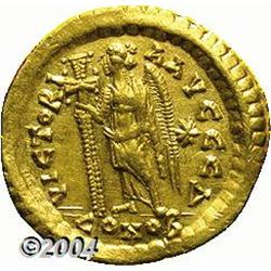<B>Leo I.</B></I> A.D. 457-474. AV solidus (20 mm, 4.44 g). Constantinople, A.D. 462-473. Diademed, helmeted and cuirassed bust facing slightly right, holding spear and shield decorated with a horseman spearing fallen enemy / Victory standing left, holding long jewelled cross; star in right field; (Delta)/CONOB. RIC 605; Depeyrot 93/1. Near XF, obverse graffito. <BR><I>From the Geneva Collection.</B></I> <BR><BR><B>Important notice:</B> Heritage usually auctions material at the rate of 200-250 lots per hour. On some occasions eBay Live bid software or the Internet may not be able to keep up with the pace of the auction. We recommend placing a realistic absentee bid now as insurance to avoid disappointment. Occasionally the auctioneer may eliminate or reject an eBay Live bid, and the auctioneer may also reopen a lot after the close of the eBay live bidding (usually because we missed an audience bid), and may reject your bid even if it shows you as the winning bidder. By bidding via eBay Live, you agree that Heritage may award the lot to another bidder at its sole discretion under the circumstances described above or any other reasonable circumstances. Since eBay bids are not shown to us until we open the lot on the floor, we treat those bids just like floor bids. In most cases the floor responds before the eBay bid is presented to us, due to Internet lag time, so for consistency we have made it a policy that floor bids are always considered first over tie eBay live bids. Also please note that all Heritage lots purchased through eBay Live carry a 20% Buyer's Premium. Please make sure you read the Terms and Conditions before you bid.
