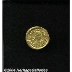<B>Leo I.</B></I> A.D. 457-474. AV solidus (20 mm, 4.44 g). Constantinople, A.D. 462-473. Diademed, helmeted and cuirassed bust facing slightly right, holding spear and shield decorated with a horseman spearing fallen enemy / Victory standing left, holding long jewelled cross; star in right field; (Delta)/CONOB. RIC 605; Depeyrot 93/1. Near XF, obverse graffito. <BR><I>From the Geneva Collection.</B></I> <BR><BR><B>Important notice:</B> Heritage usually auctions material at the rate of 200-250 lots per hour. On some occasions eBay Live bid software or the Internet may not be able to keep up with the pace of the auction. We recommend placing a realistic absentee bid now as insurance to avoid disappointment. Occasionally the auctioneer may eliminate or reject an eBay Live bid, and the auctioneer may also reopen a lot after the close of the eBay live bidding (usually because we missed an audience bid), and may reject your bid even if it shows you as the winning bidder. By bidding via eBay Live, you agree that Heritage may award the lot to another bidder at its sole discretion under the circumstances described above or any other reasonable circumstances. Since eBay bids are not shown to us until we open the lot on the floor, we treat those bids just like floor bids. In most cases the floor responds before the eBay bid is presented to us, due to Internet lag time, so for consistency we have made it a policy that floor bids are always considered first over tie eBay live bids. Also please note that all Heritage lots purchased through eBay Live carry a 20% Buyer's Premium. Please make sure you read the Terms and Conditions before you bid.