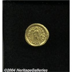 <B>Leo I.</B></I> A.D. 457-474. AV solidus (20 mm, 4.44 g). Constantinople, A.D. 462-473. Diademed, helmeted and cuirassed bust facing slightly right, holding spear and shield decorated with a horseman spearing fallen enemy / Victory standing left, holding long jewelled cross; star in right field; (Delta)/CONOB. RIC 605; Depeyrot 93/1. Near XF, obverse graffito. <BR><I>From the Geneva Collection.</B></I> <BR><BR><B>Important notice:</B> Heritage usually auctions material at the rate of 200-250 lots per hour. On some occasions eBay Live bid software or the Internet may not be able to keep up with the pace of the auction. We recommend placing a realistic absentee bid now as insurance to avoid disappointment. Occasionally the auctioneer may eliminate or reject an eBay Live bid, and the auctioneer may also reopen a lot after the close of the eBay live bidding (usually because we missed an audience bid), and may reject your bid even if it shows you as the winning bidder. By bidding via eBay Live, you agree that Heritage may award the lot to another bidder at its sole discretion under the circumstances described above or any other reasonable circumstances. Since eBay bids are not shown to us until we open the lot on the floor, we treat those bids just like floor bids. In most cases the floor responds before the eBay bid is presented to us, due to Internet lag time, so for consistency we have made it a policy that floor bids are always considered first over tie eBay live bids. Also please note that all Heritage lots purchased through eBay Live carry a 20% Buyer's Premium. Please make sure you read the Terms and Conditions before you bid.