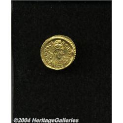 <B>Leo I.</B></I> A.D. 457-474. AV solidus (20 mm, 4.47 g). Constantinople, A.D. 462-473. Diademed, helmeted and cuirassed bust facing slightly right, holding spear and shield decorated with a horseman spearing fallen enemy / Victory standing left, holding long jewelled cross; star in right field; E/CONOB. RIC 605; Depeyrot 93/1. XF. <BR><I>From the Geneva Collection.</B></I> <BR><BR><B>Important notice:</B> Heritage usually auctions material at the rate of 200-250 lots per hour. On some occasions eBay Live bid software or the Internet may not be able to keep up with the pace of the auction. We recommend placing a realistic absentee bid now as insurance to avoid disappointment. Occasionally the auctioneer may eliminate or reject an eBay Live bid, and the auctioneer may also reopen a lot after the close of the eBay live bidding (usually because we missed an audience bid), and may reject your bid even if it shows you as the winning bidder. By bidding via eBay Live, you agree that Heritage may award the lot to another bidder at its sole discretion under the circumstances described above or any other reasonable circumstances. Since eBay bids are not shown to us until we open the lot on the floor, we treat those bids just like floor bids. In most cases the floor responds before the eBay bid is presented to us, due to Internet lag time, so for consistency we have made it a policy that floor bids are always considered first over tie eBay live bids. Also please note that all Heritage lots purchased through eBay Live carry a 20% Buyer's Premium. Please make sure you read the Terms and Conditions before you bid.