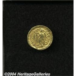 <B>Leo I.</B></I> A.D. 457-474. AV solidus (20 mm, 4.40 g). Constantinople, A.D. 462-473. Diademed, helmeted and cuirassed bust facing slightly right, holding spear and shield decorated with a horseman spearing fallen enemy / Victory standing left, holding long jewelled cross; star in right field; I/CONOB. RIC 605; Depeyrot 93/1. VF, obverse graffito. <BR><I>From the Geneva Collection.</B></I> <BR><BR><B>Important notice:</B> Heritage usually auctions material at the rate of 200-250 lots per hour. On some occasions eBay Live bid software or the Internet may not be able to keep up with the pace of the auction. We recommend placing a realistic absentee bid now as insurance to avoid disappointment. Occasionally the auctioneer may eliminate or reject an eBay Live bid, and the auctioneer may also reopen a lot after the close of the eBay live bidding (usually because we missed an audience bid), and may reject your bid even if it shows you as the winning bidder. By bidding via eBay Live, you agree that Heritage may award the lot to another bidder at its sole discretion under the circumstances described above or any other reasonable circumstances. Since eBay bids are not shown to us until we open the lot on the floor, we treat those bids just like floor bids. In most cases the floor responds before the eBay bid is presented to us, due to Internet lag time, so for consistency we have made it a policy that floor bids are always considered first over tie eBay live bids. Also please note that all Heritage lots purchased through eBay Live carry a 20% Buyer's Premium. Please make sure you read the Terms and Conditions before you bid.