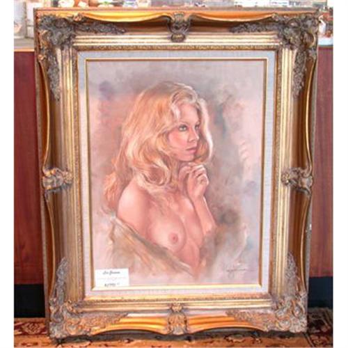 Beautiful blonde nude woman by master artist Leo Jansen. Known for his stunning nudes of Playmates and movie stars as well as collectible Mother's Day and children plates. Authentic work with thumbprint and back stamps. Beautiful ornate frame.