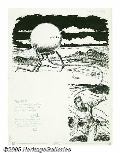 <B>Leo Morey - "World of Slaves" Pulp Illustration Original Art (undated).</B></I> Ever since H. G. Wells' celebrated <B>War of the Worlds</B></I> story, science-fiction fans have been fascinated with a theme of machine weapons which attempt to enslave mankind. From <B>Magnus, Robot Fighter</B></I> to "The Matrix", the theme never fails to captivate! Leo Morey's pulp vison ranks among the best visualizations of this leit motif and this drawing was once housed in the collection of science-fiction maven Sam Moskowitz, who is often cited as the world's foremost authority on science-fiction. Leo Morey became the chief artist for <B>Amazing Stories</B></I> after Frank R. Paul left the title. The overall size of this ink on board illustration measures 11.25" x 15" and the art is in Excellent condition.