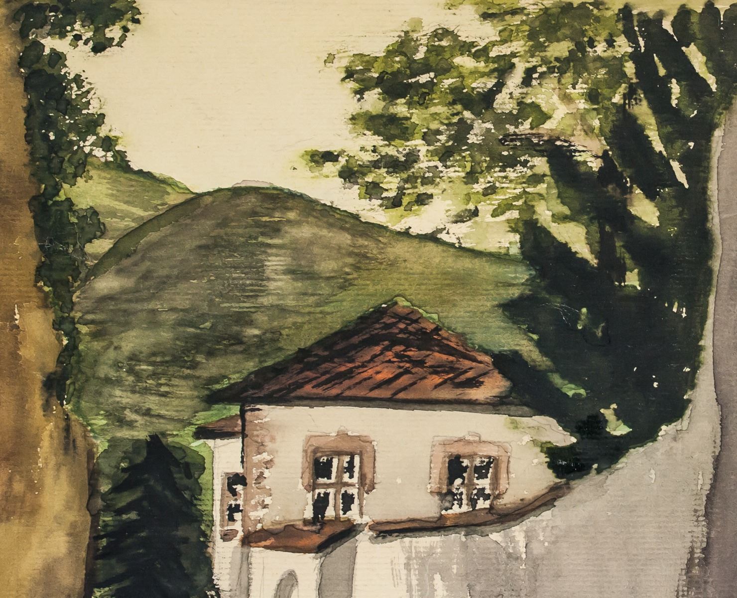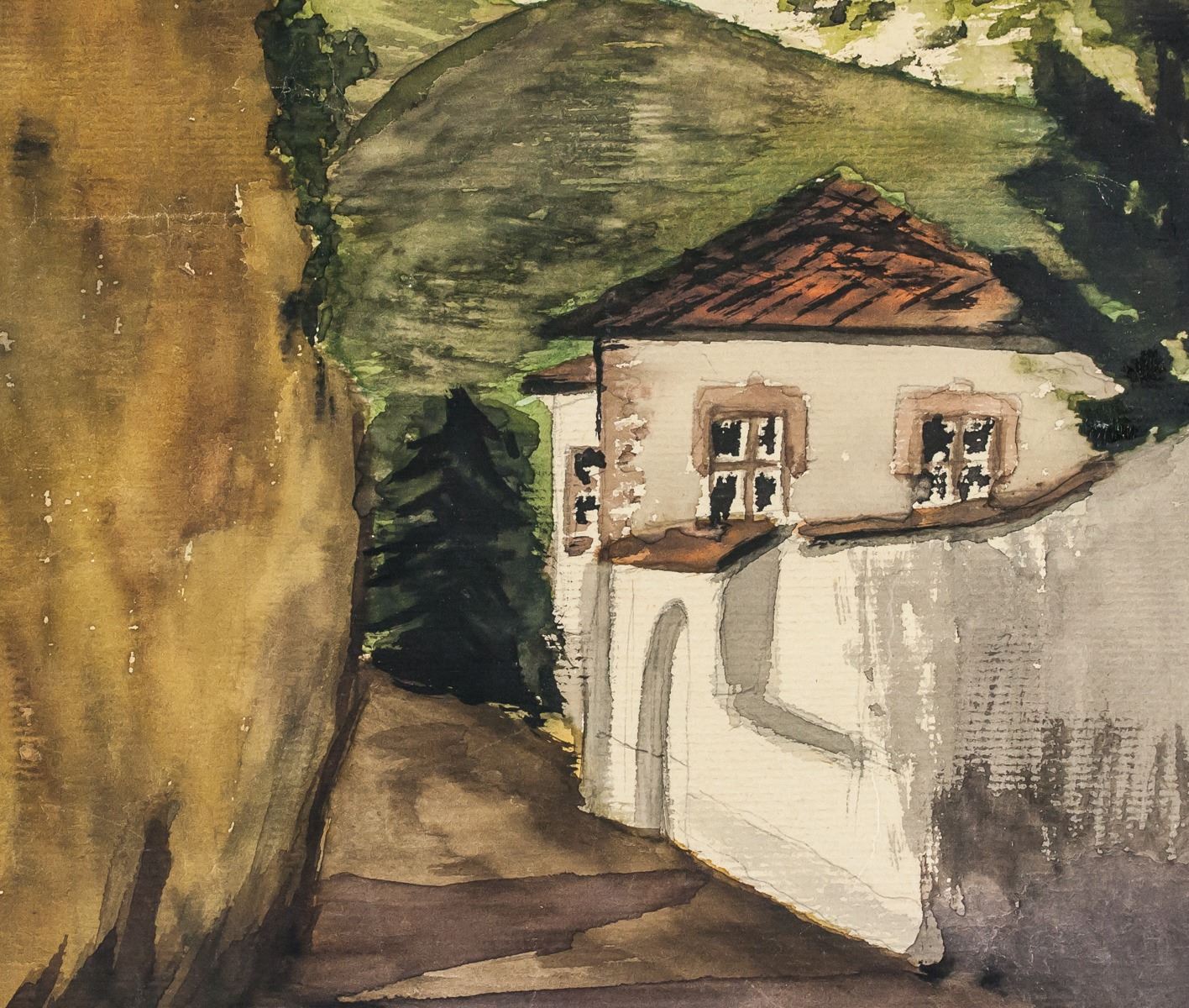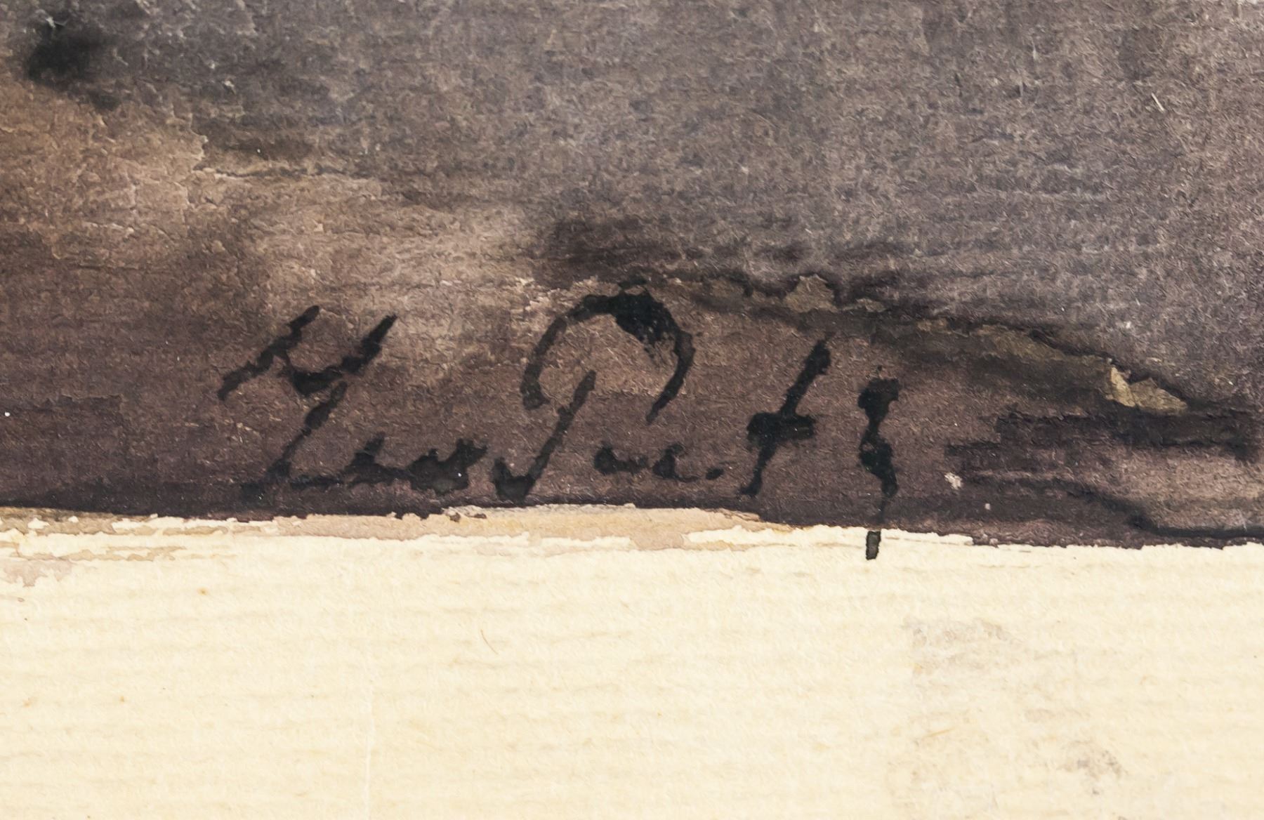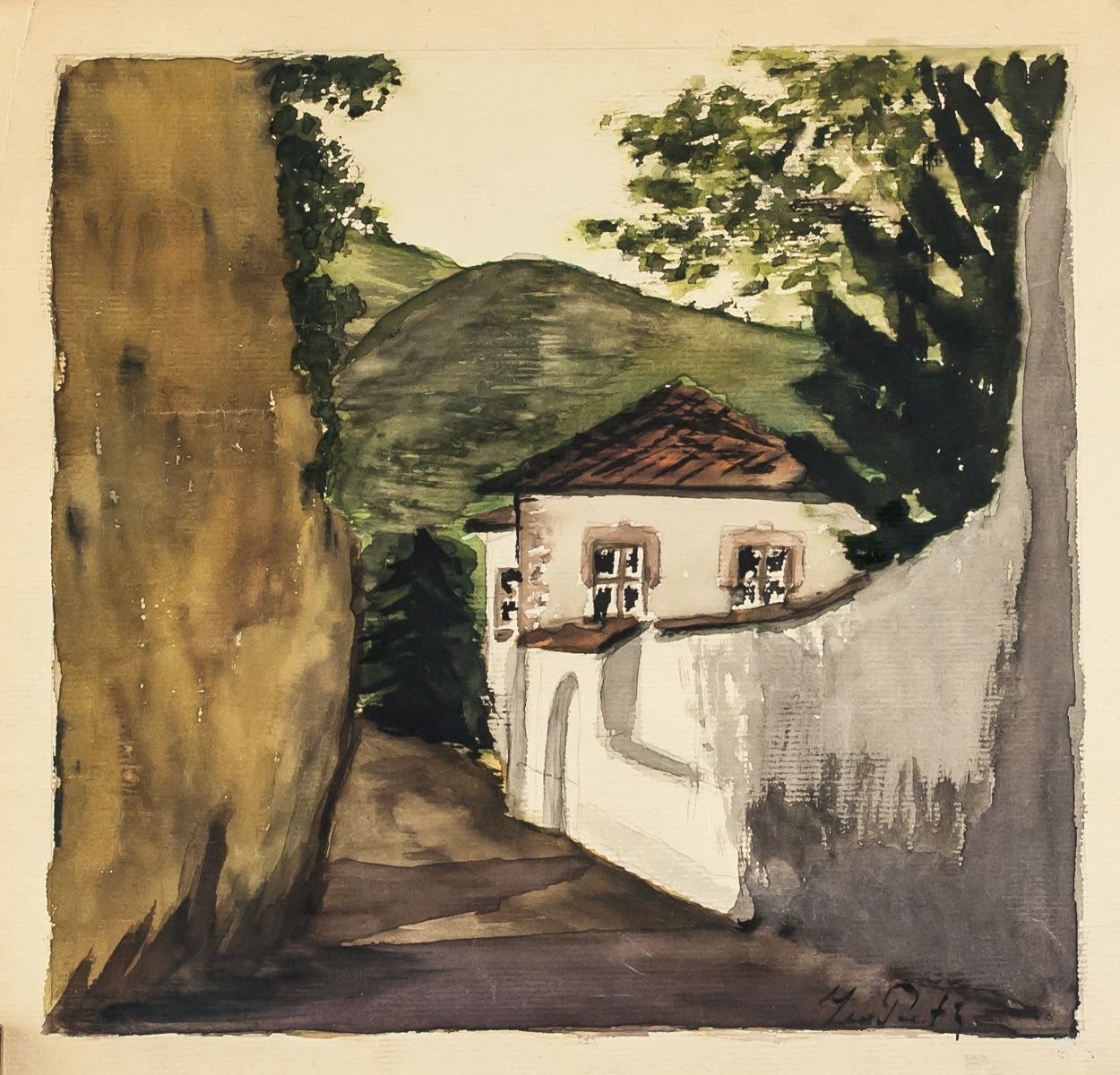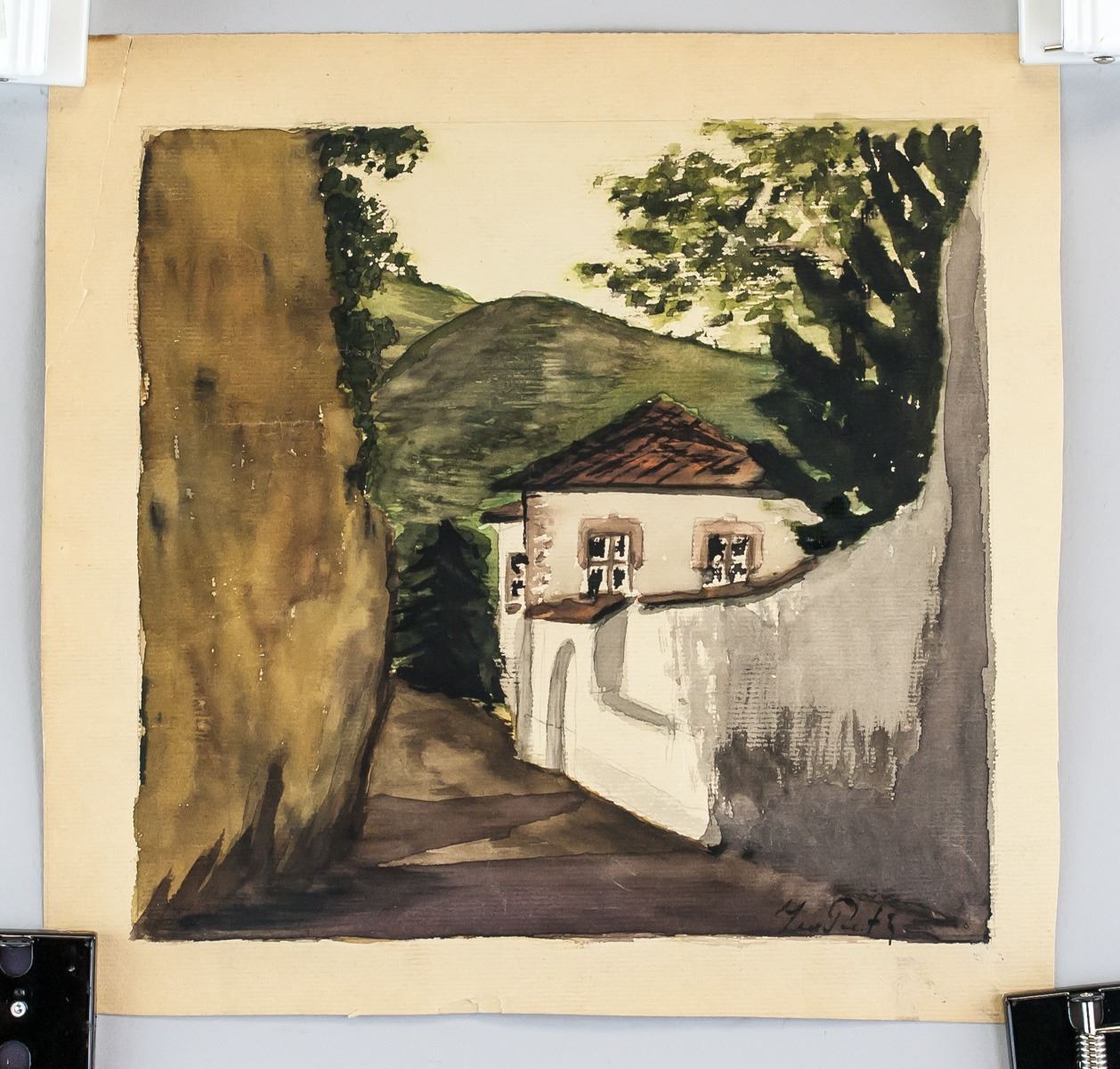 Watercolor on paper. Featuring landscape scene through town alleyway. Signed Leo Putz on the lower right corner. Attributed to Leo Putz (1869-1940, German). 24 x 24.5 cm (9.5 x 9.75 in). PROVENANCE: Southern Ontario estate