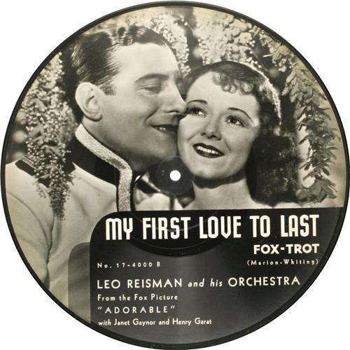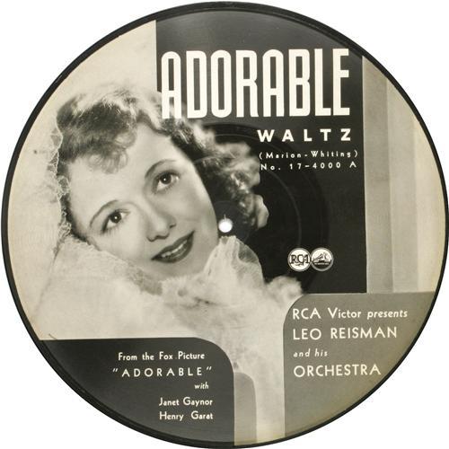 <B>Janet Gaynor Memorabilia "Adorable" 10" Picture Disc (RCA 17-4000, 1933).</B></I> Backed with "My First Love To Last", both tunes are from the Fox Picture <I>Adorable</B></I> starring Janet Gaynor, who is pictured on both sides of this early picture disc. The music is by Leo Reisman and His Orchestra. Unique bit of Hollywood and recording history! Condition: VG-EX 6.<BR><BR><b>Shipping:</b> Flat Material, Small (<a target="_blank" href="http://www.heritageauctions.com/common/shipping.php">view shipping information</a>)