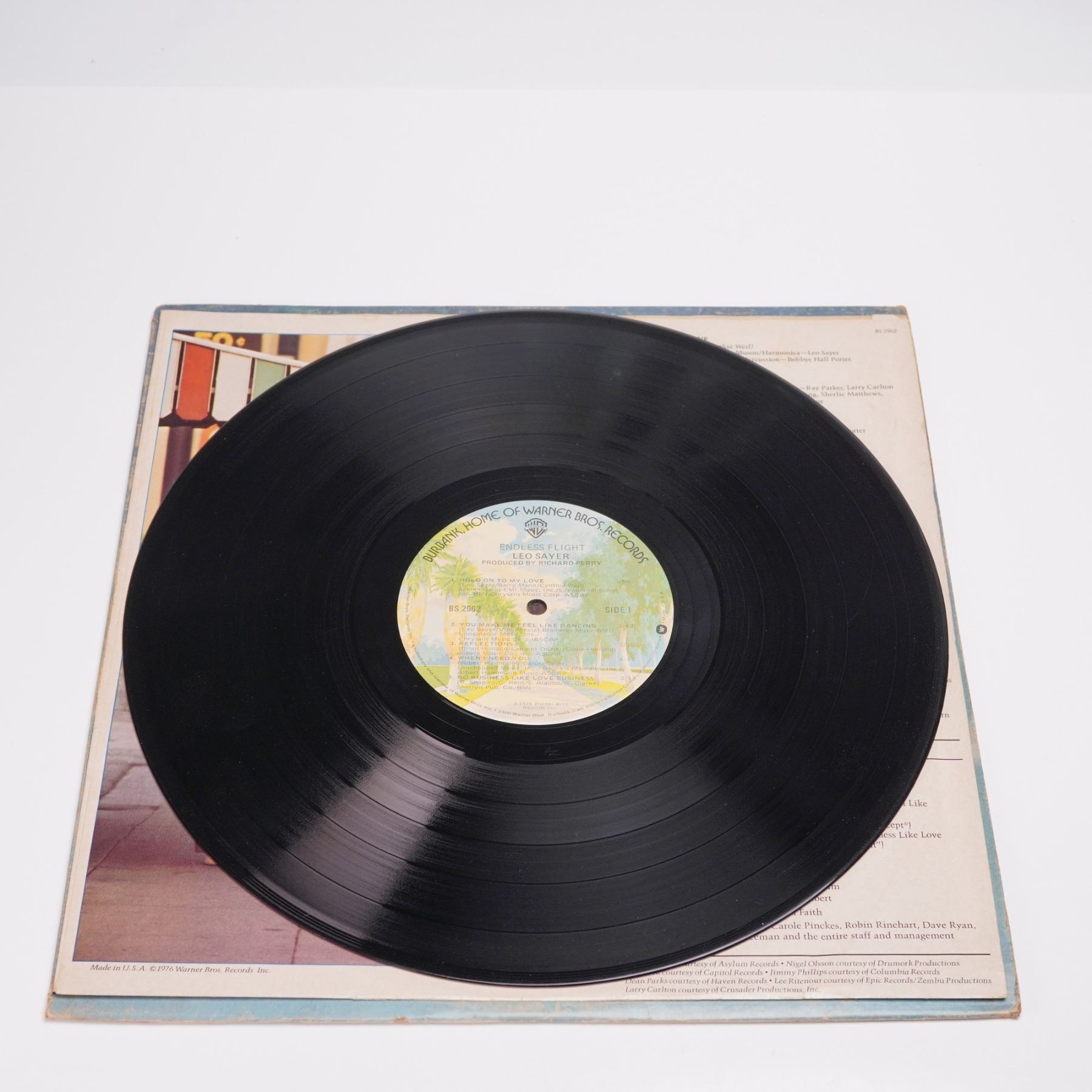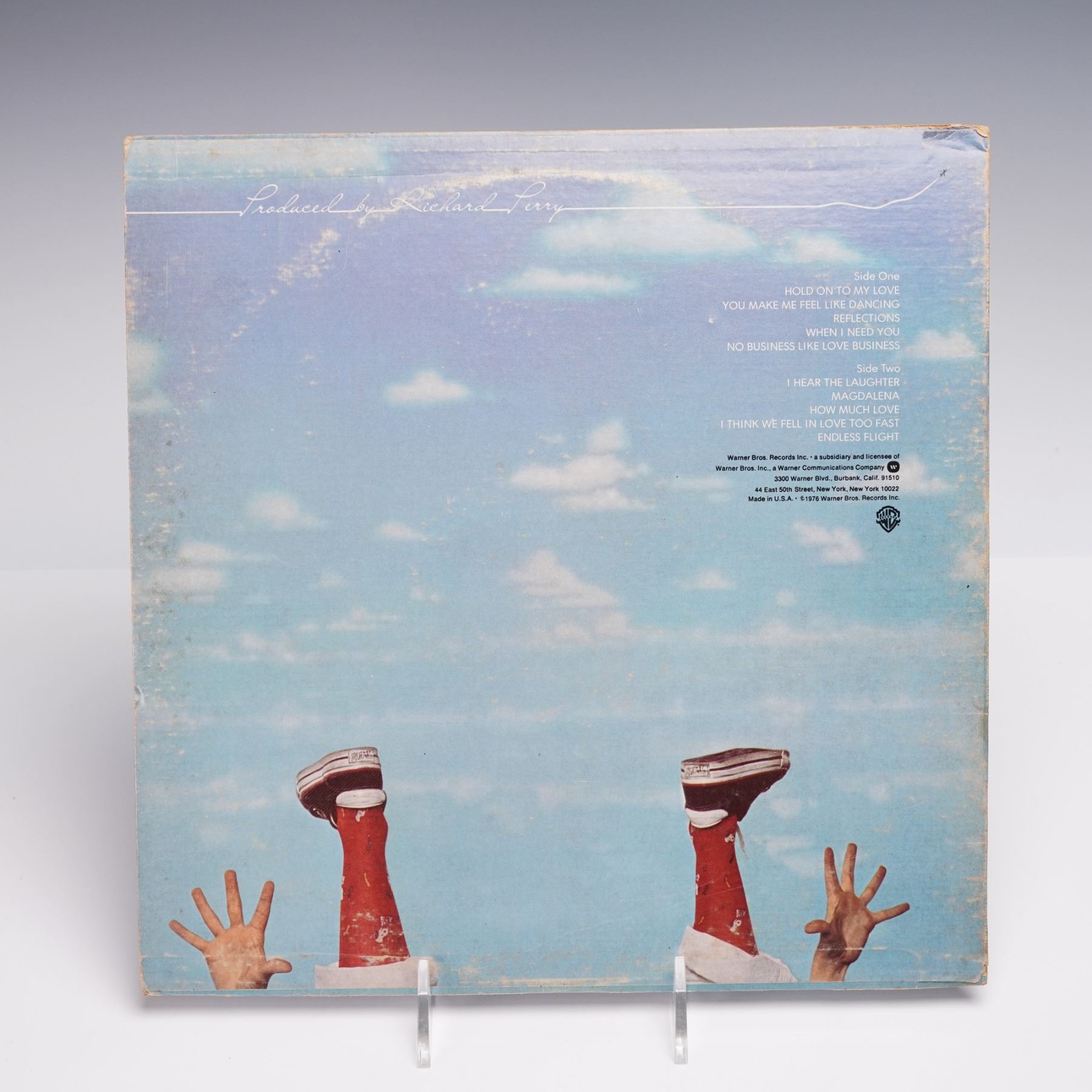 Leo Sayer Endless Flight, 12 inch vinyl LP album released in 1976 by Warner Bros Records, catalog number BS 2969, produced by Richard Perry, featuring tracks including You Make Me Feel Like Dancing and When I Need You, original cover art with image of Leo Sayer in midair against a sky background, back cover shows hands and feet pointing upward with track listing, Warner Bros palm tree label on vinyl. Measures 12.5"L x 12.5"H.