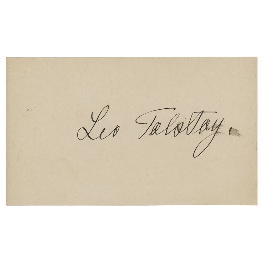 Large ink signature, "Leo Tolstoy,†on an off-white 5.5 x 3.25 card. In very fine condition, with a trivial brush to the end of the signature.