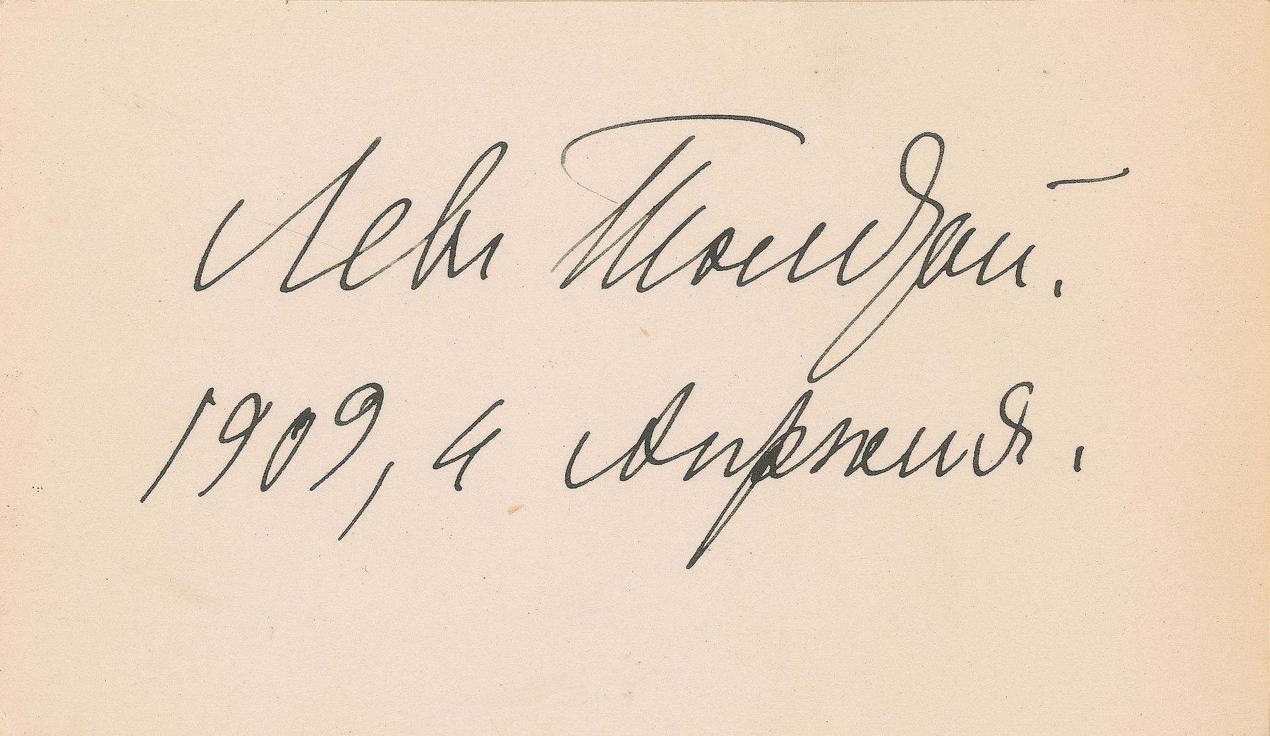 Sought-after ink signature of Leo Tolstoy in Cyrillic on an off-white 5.25 x 3 card dated to 1909. The card is affixed to a 6.5 x 7.75 sheet. In fine condition. Consignor notes that the autograph derives from the collection of diplomat Carl Harald Trolle.