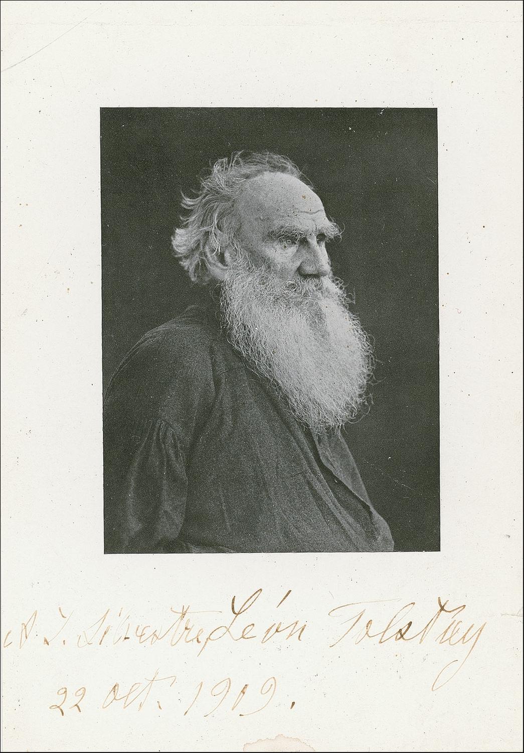 Vintage 5 x 7 book frontispiece photo, signed and inscribed in fountain pen by Tolstoy, adding the date “22 Oct. 1909.” Tear to right edge, small stain to lower edge, and irregular ink adhesion to the somewhat light handwriting, otherwise fine condition. A desirable image of one of the world’s greatest novelists, signed a little over a year before his death.