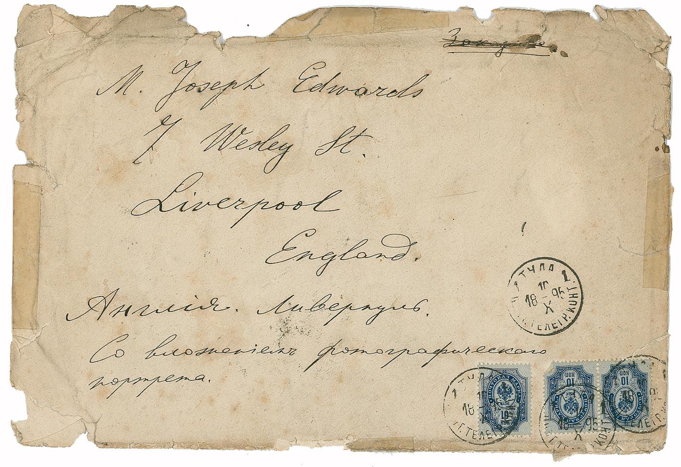 Original vintage signed ink sketch of Tolstoy sitting outdoors, done by an unknown artist, on a 4 x 5.25 sheet and affixed to a 5 x 7 light gray heavy stock card. Signed under the image in black ink, “Leo Tolstoy, 1895, 17. October.” In very good condition, with much of Tolstoy’s facial features indistinct, lending an eerie ghost-like quality to image, creasing to lower right affecting signature, some scattered light soiling and foxing to edges, and a few spots to image. A well-done image of one of the most influential writers of the 19th century. Accompanied by the original mailing envelope, addressed to Joseph Edwards of Liverpool, England, presumably the artist.