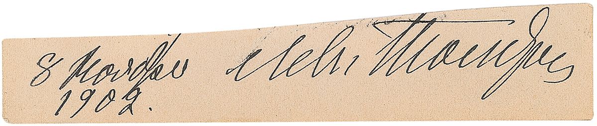 Bold ink signature, in Cyrillic, on an off-white 4.5 x .75 clipped slip dated 1902. In fine condition, with some mild toning. Accompanied by an unsigned cabinet photo.