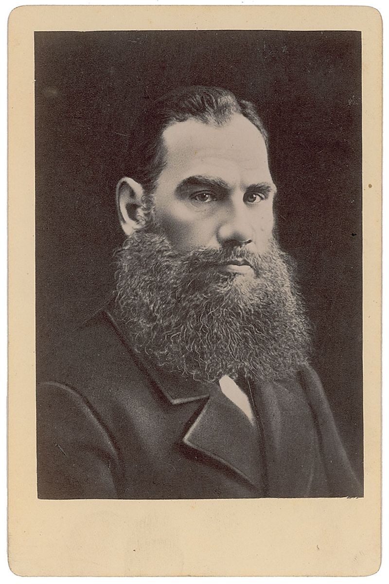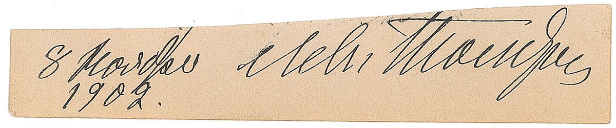 Large and bold ink signature, in Cyrillic, on an off-white 4.5 x 1 slip dated 1902. In fine condition. Accompanied by an unsigned cabinet photo of a younger Tolstoy by an anonymous studio.