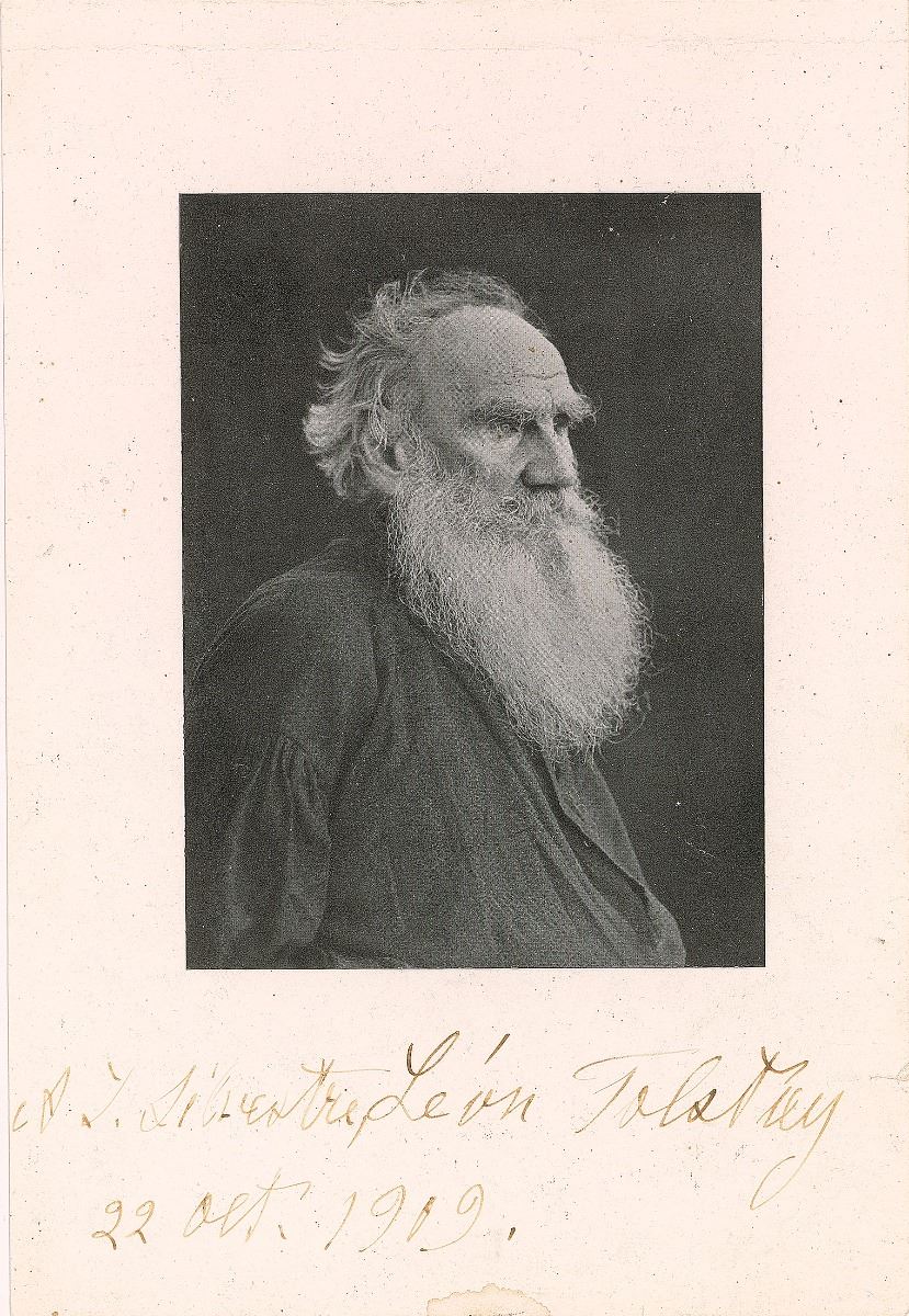 Uncommon high-quality 5 x 7 paperstock photo of the great Russian author in near-profile, signed and inscribed in fountain pen, “A I. Silvestre, Leon Tolstoy, 22 Oct. 1909.” In fine condition; evidently a page or frontispiece removed from a book. Tolstoy began his famous correspondence with Mohandas Gandhi in October 1909, an exchange that continued until the end of his life in November 1910; Tolstoy’s beliefs in nonviolence and passive resistance had a profound influence on the development of Gandhi’s ideals. An exceptional image of the Russian master.