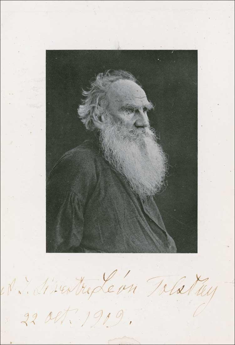 Just a few weeks before he signed this image, Tolstoy began a correspondence with Gandhi, with the duo exchanging views on the unrest in India and at one point Tolstoy noting that the “fight between gentleness and brutality, between humility and love on one side, and conceit and violence on the other, makes itself ever more strongly felt here.” Purportedly, Tolstoy’s rejection of modern industrial society had helped shape Gandhi’s own views on communal living. This same year, Tolstoy was also invited to attend the International Peace Congress in Sweden, an invitation that the famed pacifist—and anarchist—accepted, much to surprise of event organizers. Tolstoy is quite scarce, particularly in signed photos. Pre-certified John Reznikoff/PSA/DNA and RRAuction COA.