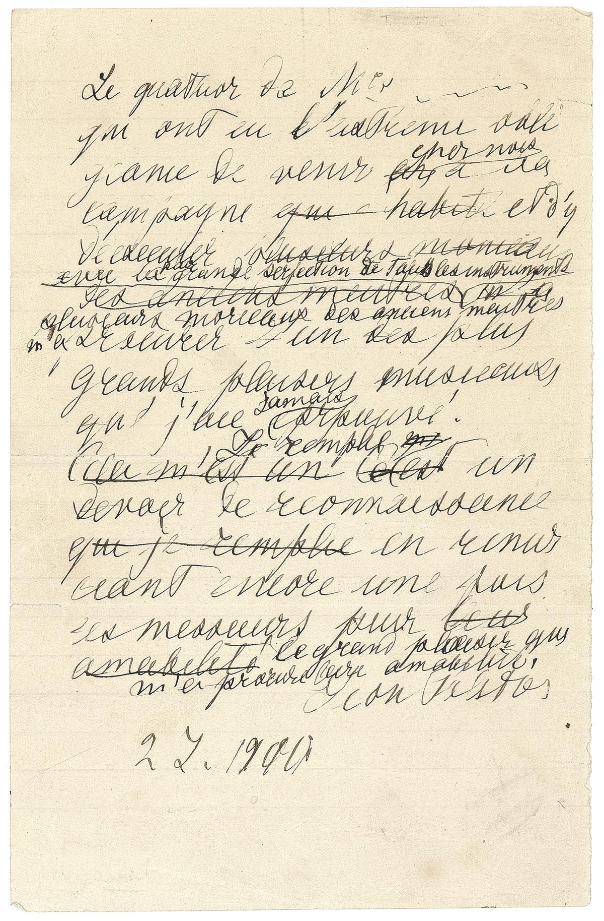 ALS in French, signed “Leon Tolstoi,” one page, lightly-lined, 5.5 x 8.25, 1900. An unpublished draft of a letter, with numerous lines crossed out and rewritten, regarding a string quartet performance. In part (translated): “The quartet…who had the extreme kindness to come to our home in the country and to play with greatest perfection on all their instruments the splendid treats of the old masters—was one of the greatest musical pleasures which I’ve ever been privileged to experience.” Light wrinkling, small split to one mailing fold, and a very faint paperclip impression at the top edge, otherwise fine condition.