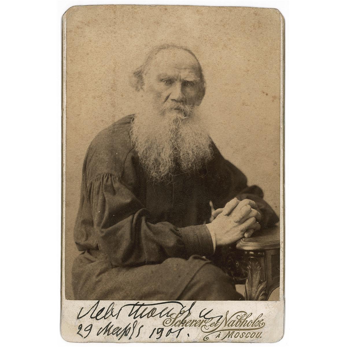 Scarce vintage original 4.25 x 6.25 cabinet photo by Scherer et Nabholz of Moscow, signed in the lower border in fountain pen, in Russian, “Leo Tolstoy, 29 March 1901.” Reverse of photo bears a pictorial photographers imprint in Russian. Some light creasing to lower borders and top corners, as well as some scattered light toning and foxing, otherwise fine condition.