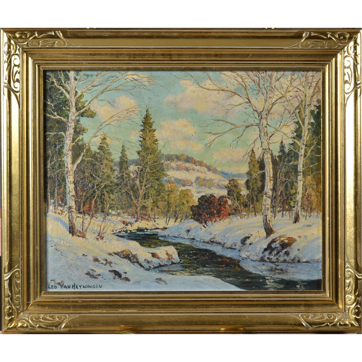 Painted to depict a winter scene with stream in a hilly landscape. Looks to be East coast scene or Pennsylvania school. Framed in a gold tone Arts & Crafts wood frame. 1/4" touch up in the center cloud. 15.25" H x 19.25" W, sight, 21" H x 25" W, framed. Circa 20th century. Private collection Troy, MI.