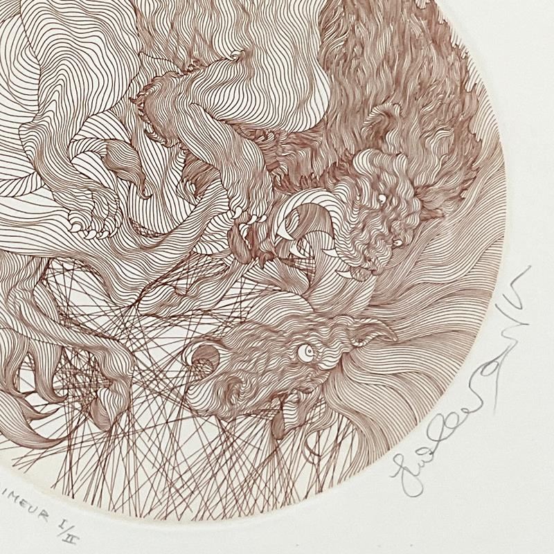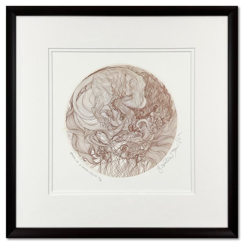 "Leo" is a limited edition etching on paper by Guillaume Azoulay, numbered I/II and hand signed by the artist. This piece comes custom framed. Includes Letter of Authenticity. Measures approx. 18" x 18" (frame), 9" (image-diameter).