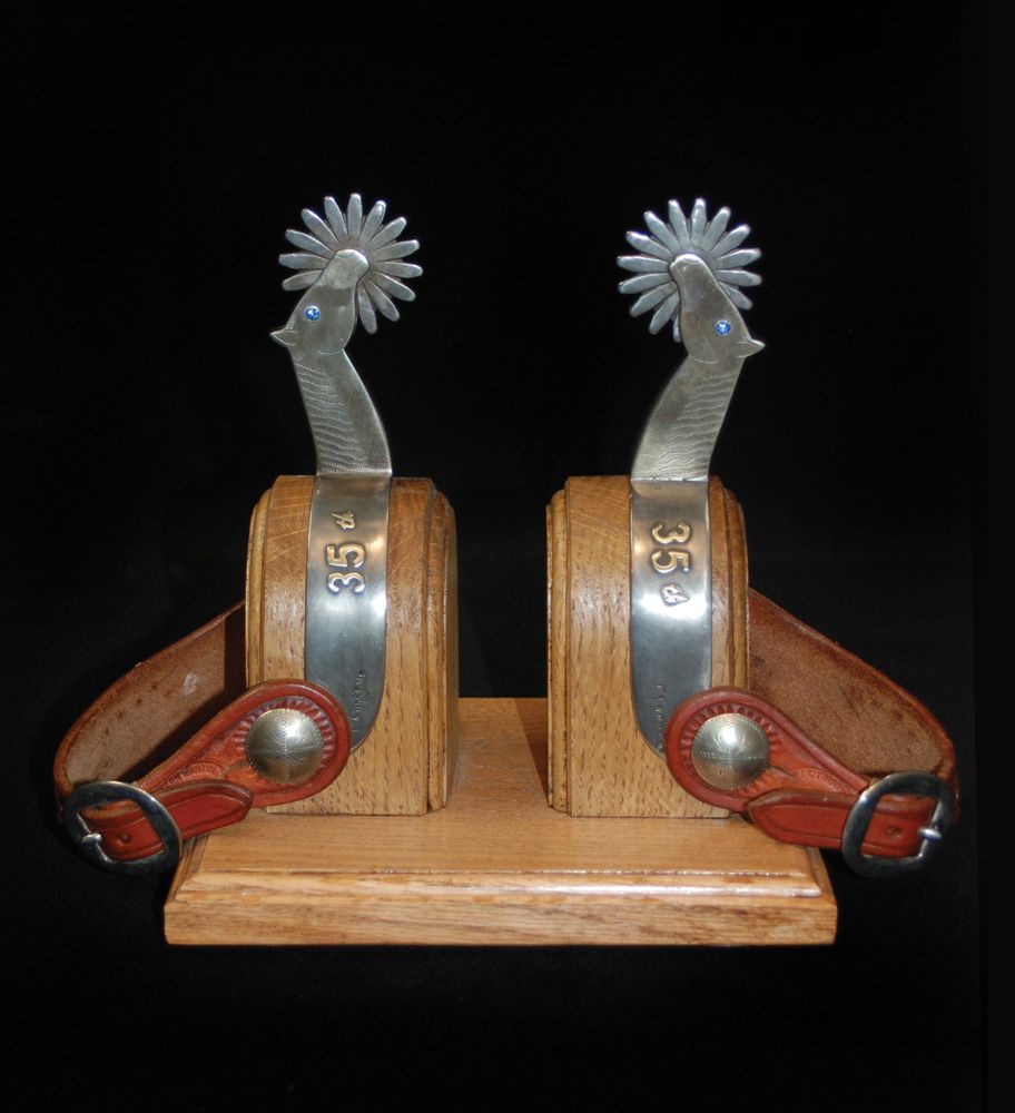 To celebrate the 35th Anniversary of the National Bit, Spur and Saddle Collectors Association, Leon Andrews, spur maker of Ponca City, OK has made this pair of double mounted horsehead shank spurs with sapphire eyes. Overlaid on one side is NBSSCA and on the 1 is 35th. Maker-marked on the 1" bands. Floral carved straps included, as is a custom wood stand.