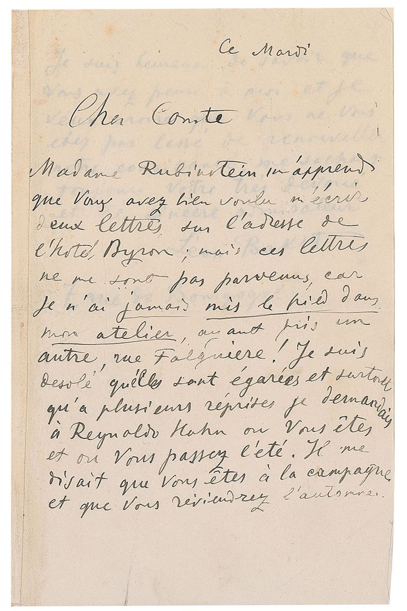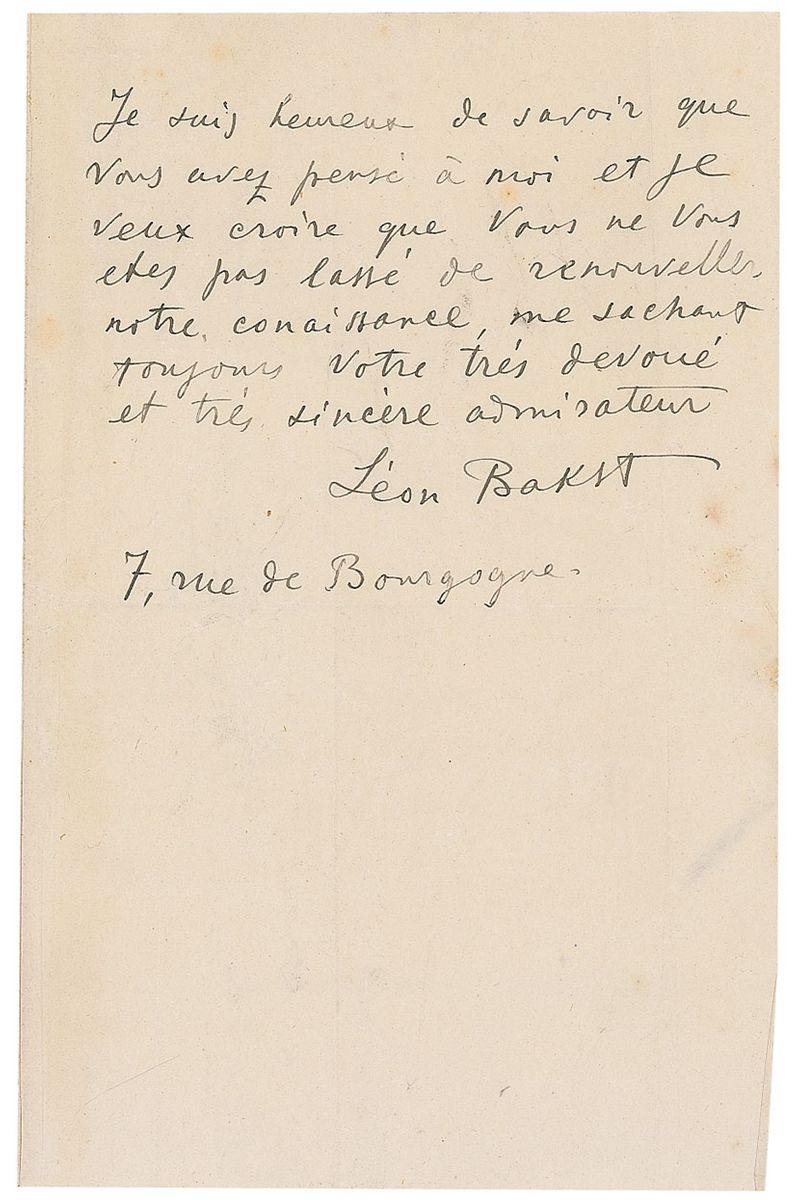 Russian painter (1866–1924) remembered for the exotic, richly colored sets and costumes that he designed for the Ballets Russes. ALS in French, two pages, 4.5 x 7, no date. Letter to Robert de Montesquiou. In part (translated): “Madame [Ida] Rubinstein has alerted me that you had attempted to write me two letters…but these letters never reached me, because I have not set foot in my studio, having obtained another on Rue Falguiere!…I asked Reynaldo Hahn where you were…He told me you were in the country and that you’d be returning in the autumn.” Pages affixed to each other with tape to the left border. In very good condition, with intersecting folds, overall creasing and wrinkling, and a few trivial spots of foxing.