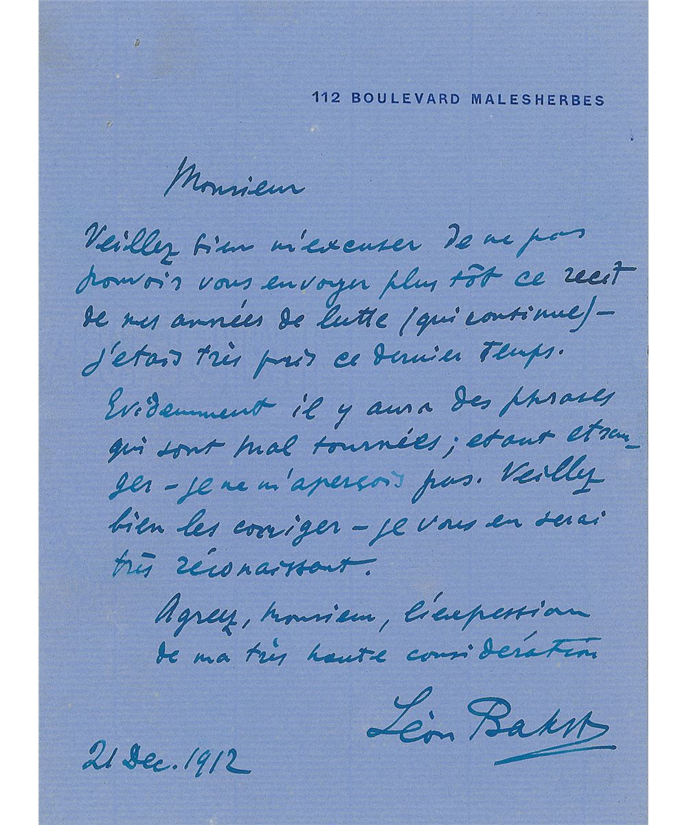Russian painter (1866–1924) remembered for the exotic, richly colored sets and costumes that he designed for the Ballets Russes. ALS in French, one page, 5.25 x 7, personal letterhead, December 21, 1912. To a publisher, sending a manuscript on his early life and allowing any alterations to be made. In fine condition. A very attractive and bold example of a scarce autograph.