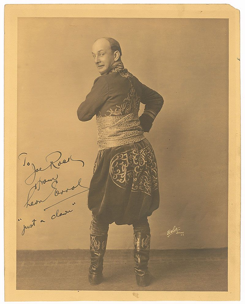 Comedy star (1881–1951) best remembered for his two-reelers dating back to the early 1930s and for his appearances opposite Lupe Velez in the ‘Mexican Spitfire’ features of the early 1940s. Vintage matte-finish 8 x 10 photo of Errol in a fancy costume, signed and inscribed in fountain pen, “To Joe Rock from Leon Errol ‘just a clown.’” In fine condition, with a missing top right corner tip.