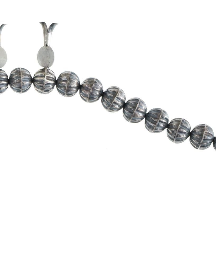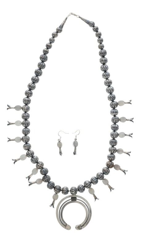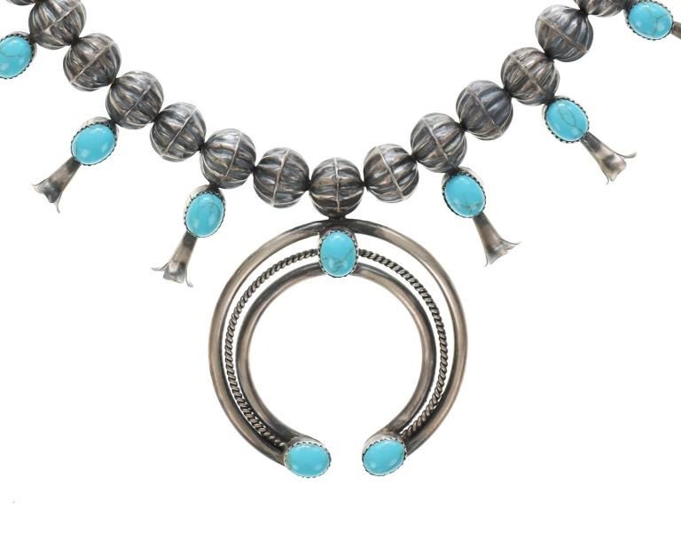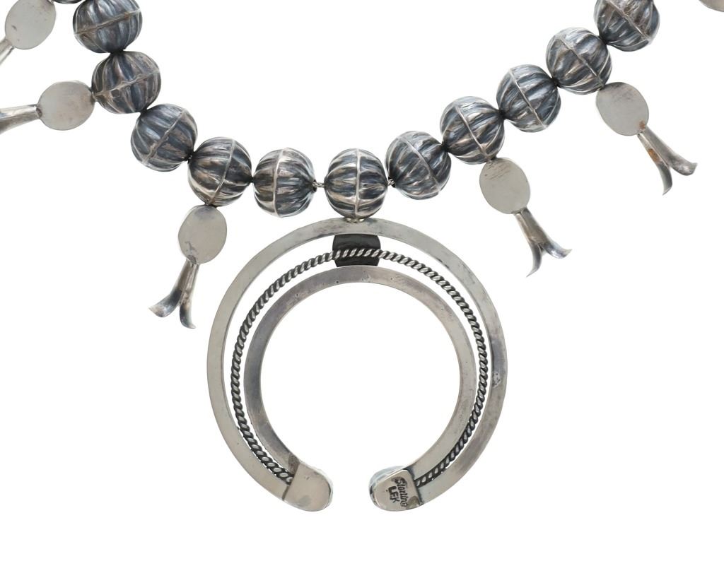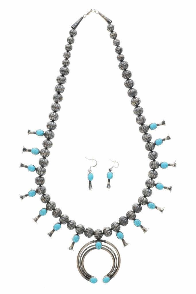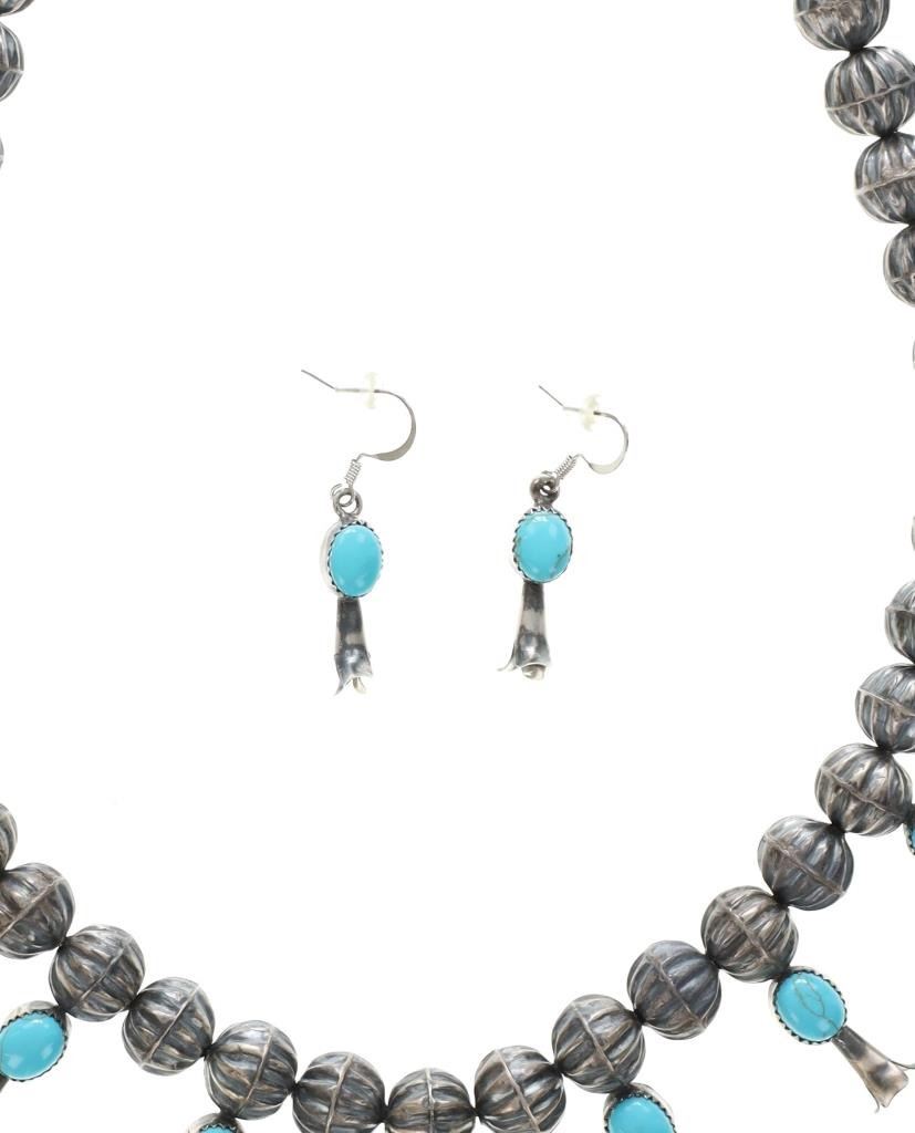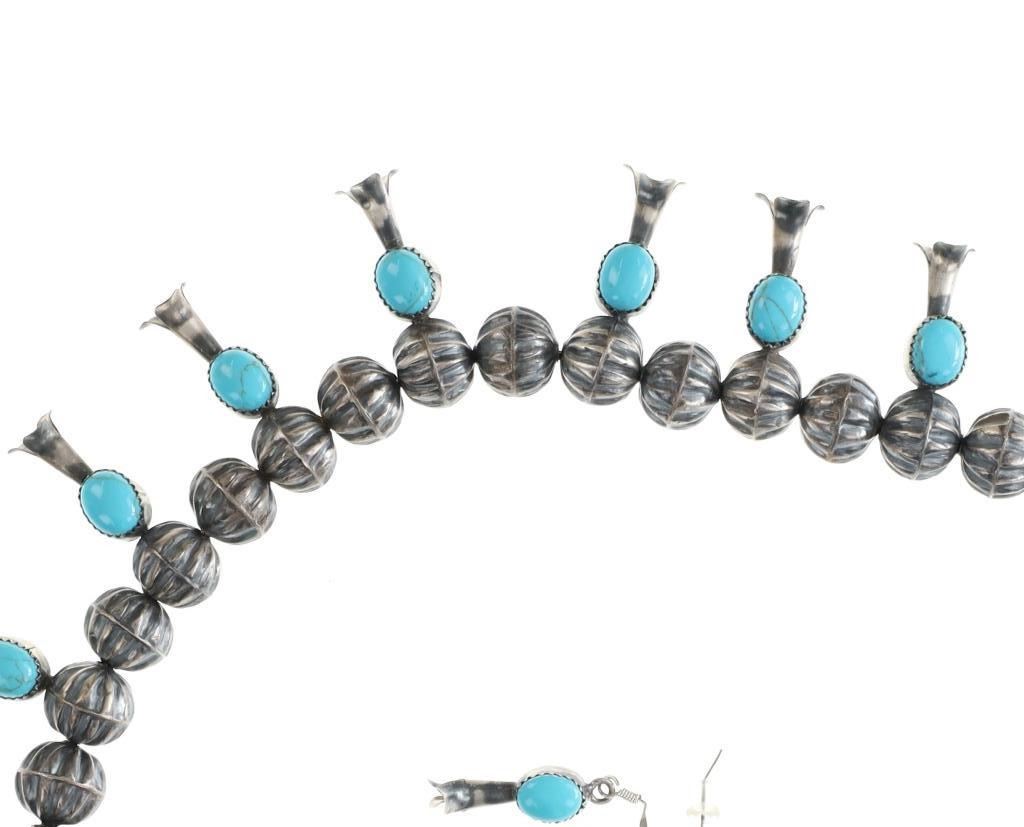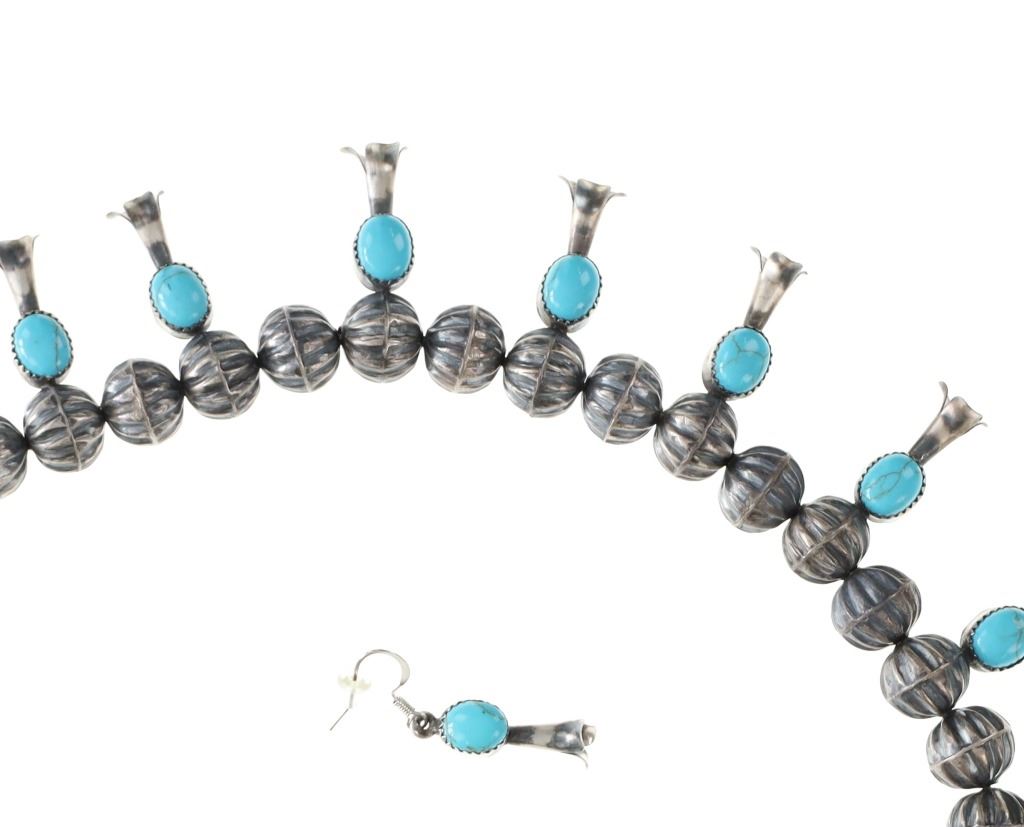 The lot features a wonderful late-vintage sterling silver squash blossom necklace and earring set from Navajo artist, Leon Frances Kirlie. The artist name can be found as Leon Frances Kirlie, L.F. Kirlie, Leon F. Kirley, and LFK / L.F.K.. The necklace shows a sterling silver box chain strand with graduated bench made hand formed sterling silver Navajo pearl beads (also referred to as concho beads, bench beads) in a graduated form with five smaller beads on each side (ten total) and a total of 43 larger beads all with a ridged presses antique style concho. There are a total of 14 blossom pendants each with a fluted "blossom" end and oval polished cabochon of wonderful Blue Gem Turquoise. At the bottom shows the classic naja squash pendant with triple strand showing two bars of silver with a rope silver center set with three polished cabochons of Blue Gem Turquoise. The necklace is signed, "LFK Sterling". The necklace is accompanied by a set of matching blossom earrings, each with fluted blossom ends and polished cabochons of Blue Gem Turquoise in matching form. A wonderful late-vintage set in brand new condition. The necklace measures overall 27"L, squash pendant is 2.75" by 2.25", and earrings are 1 5/8"L each. Total weight of 100.3 grams.