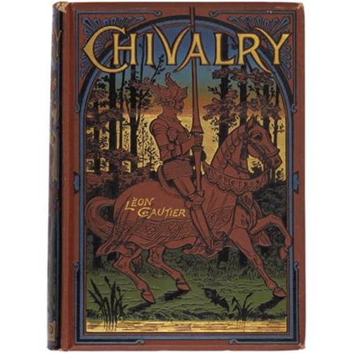 <B>Leon Gautier. </B></I><B><I>Chivalry</B></I></B></I><B>.</B></I> London: Routledge and Sons, Limited, 1891. <BR>First edition. Translated by Henry Frith. Octavo. 499 pages. Fifty-seven wood engraved illustrations (including frontispiece and 23 plates). <BR><BR>Original brown cloth over beveled boards with stamped illustration on the front board and spine in blue, gilt, green, black and orange. Gilt titles. Wear at the head and foot of spine. Corners slightly abraded. Light shelf wear to edges. Contents slightly toned, especially at the pastedowns and front free endpaper. Free front endpaper starting to detach. Small stain on the recto of the frontis. Light pencil marginalia on a few pages. A very good copy of a work seldom seen in this early original issue.<BR><BR><b>Shipping:</b> Books & Catalogs (<a target="_blank" href="http://www.heritageauctions.com/common/shipping.php">view shipping information</a>)
