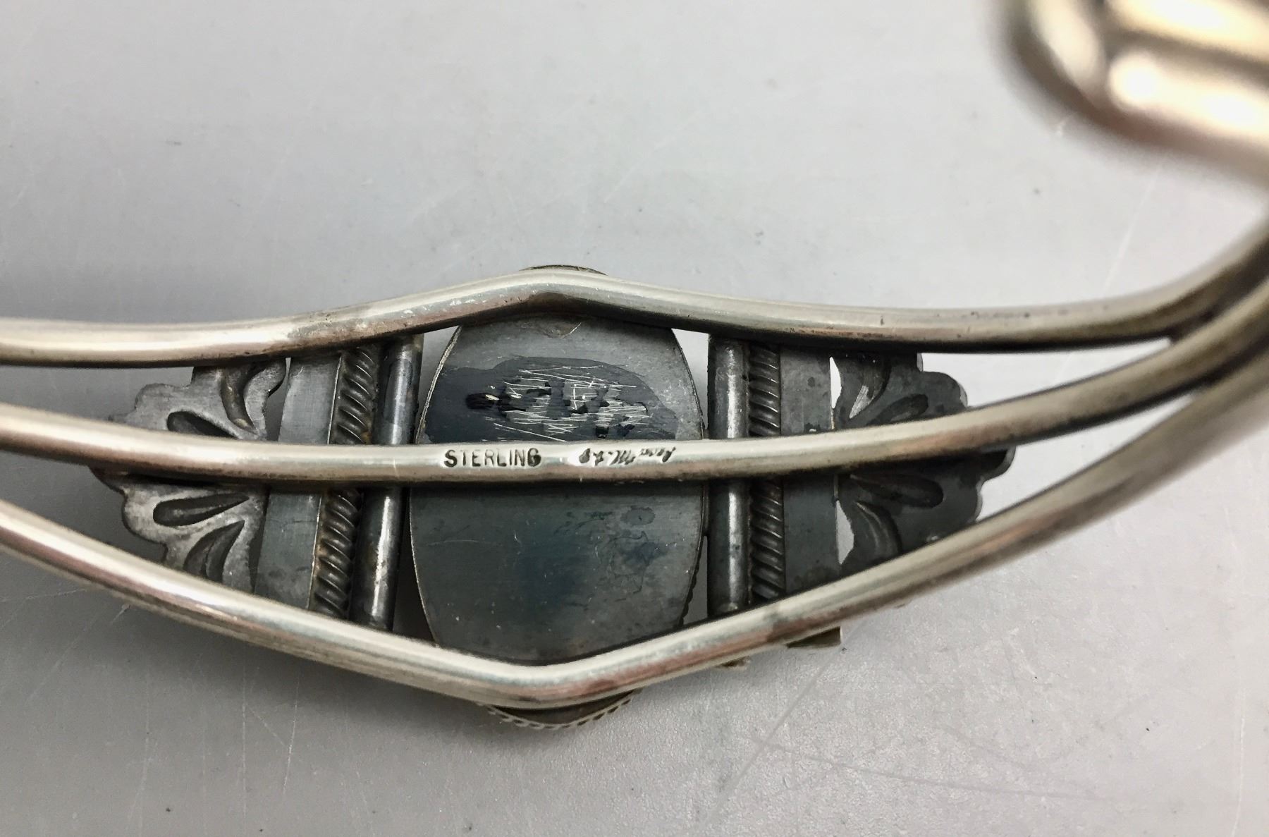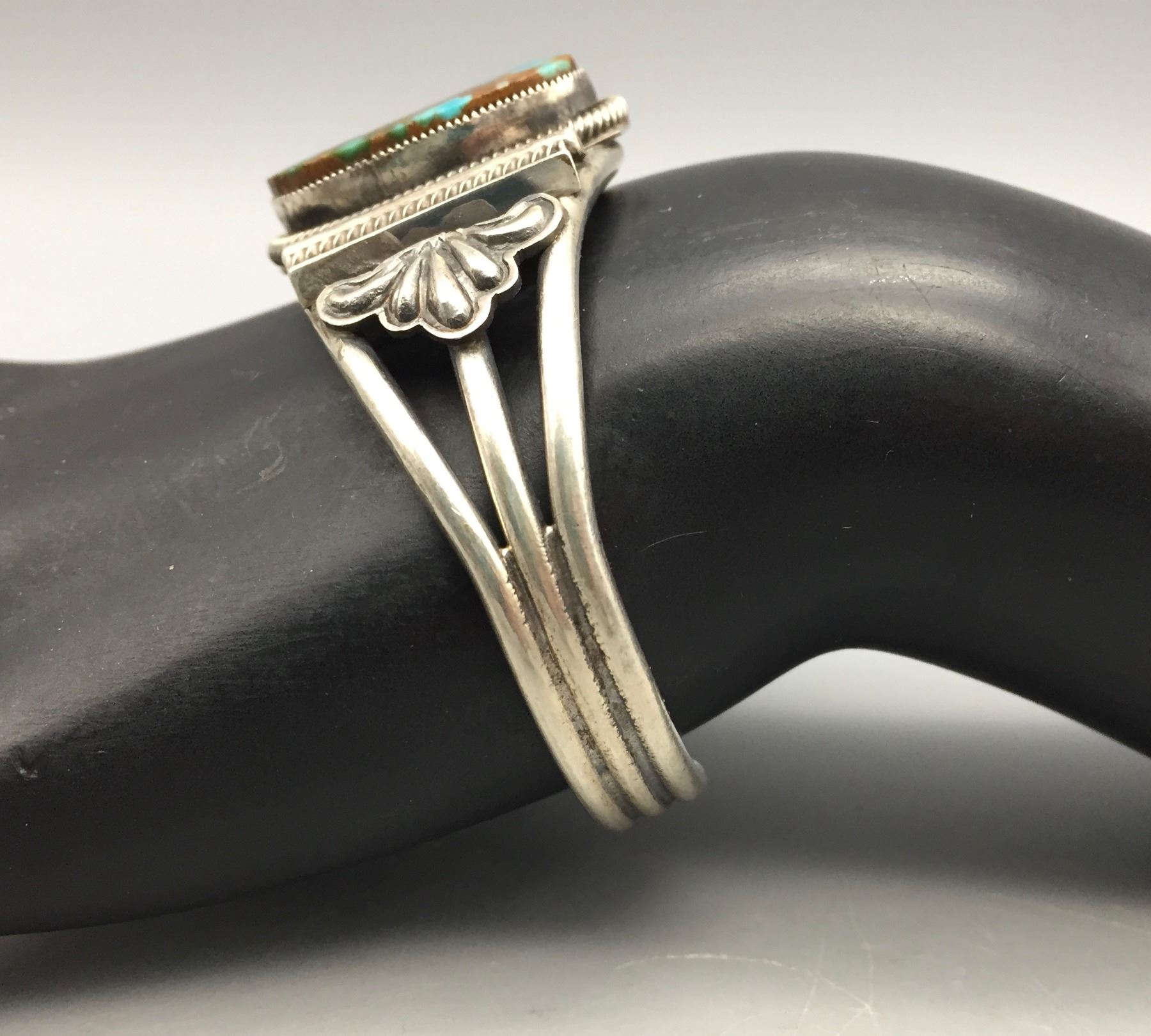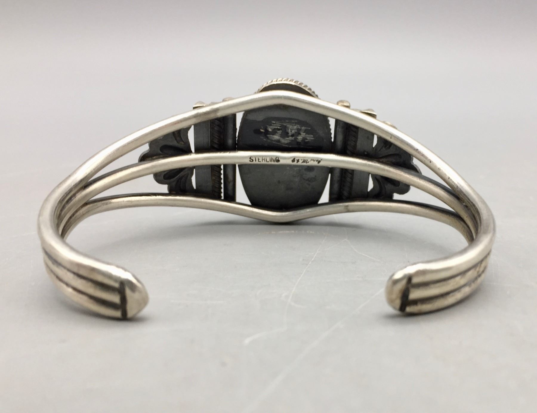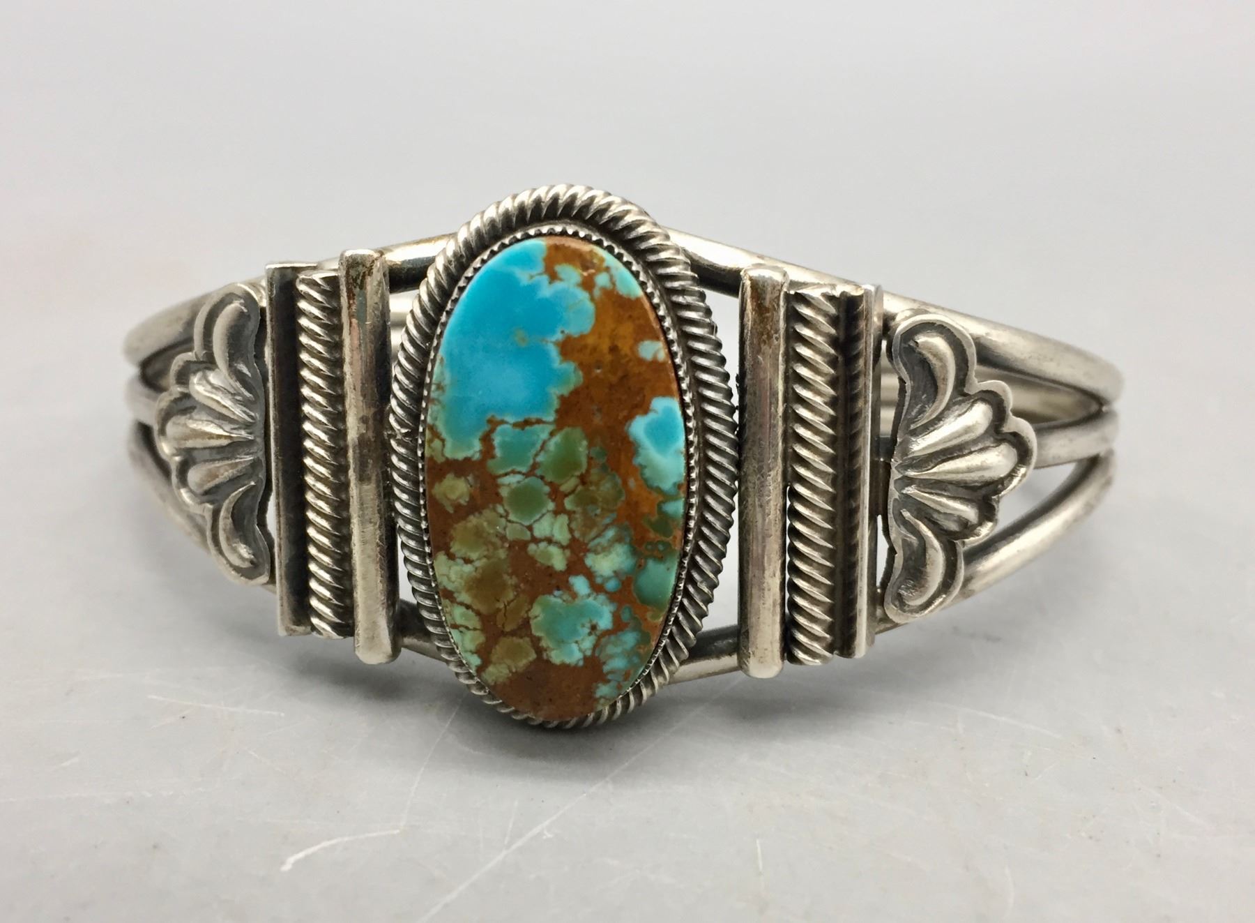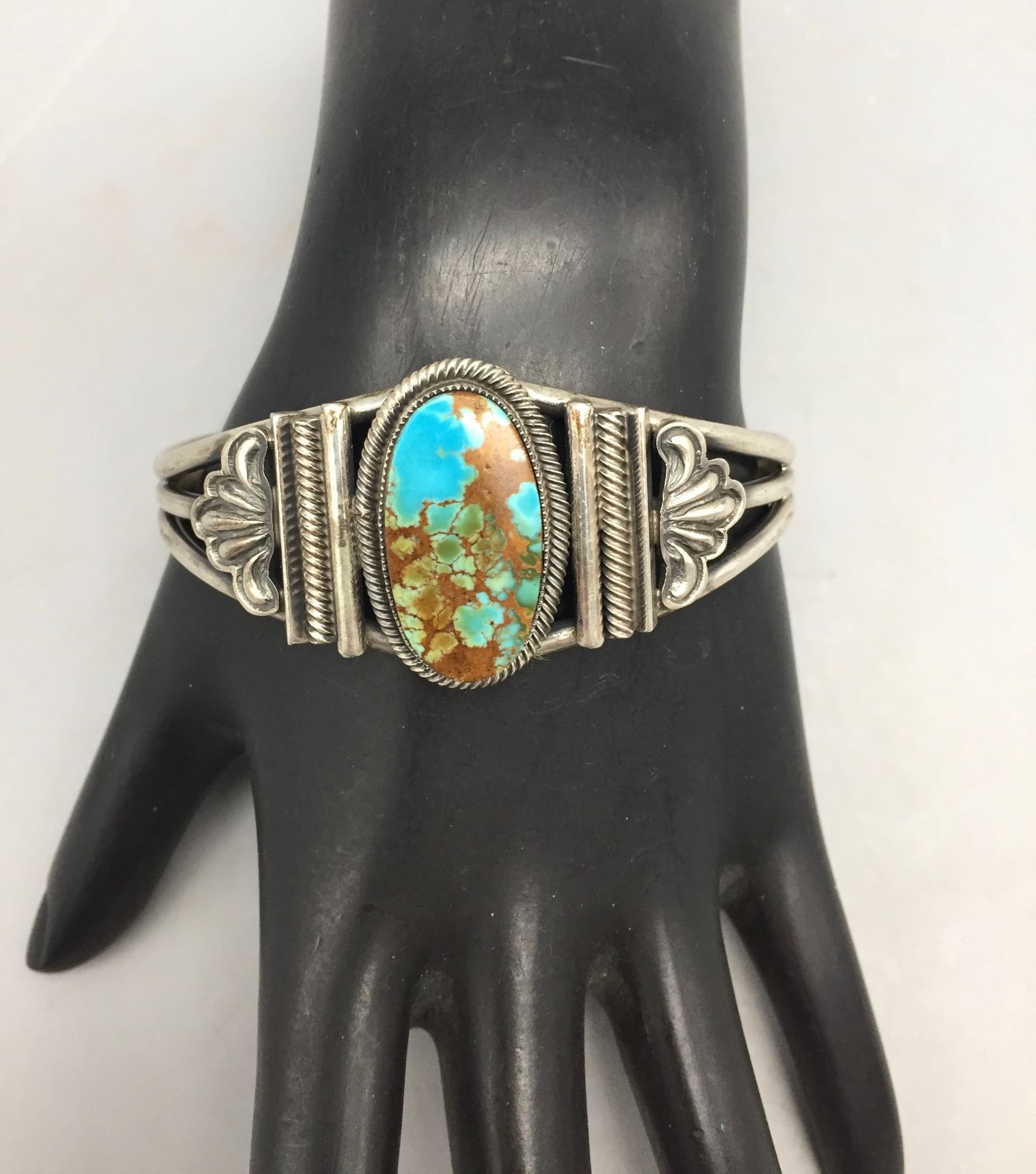 Description: Featured in this lot is a beautiful Leon Martinez bracelet, set with a stunning turquoise stone and silver appliqué. Stamped as sterling silver. Maker: Leon Martinez. Approx. Age: Modern. Size: Inside circumference is 5-1/2” additional opening is 1-1/4” (fits 6-3/4” wrist). 1 1/8” wide. Weighs 41 grams. Condition: Good for its age, normal wear expected. Please look closely at the pictures - they are an important part of our description. Shipping: There will be a $5 handling / packaging fee for shipping this lot. The actual cost of postage will be added on top of that.
