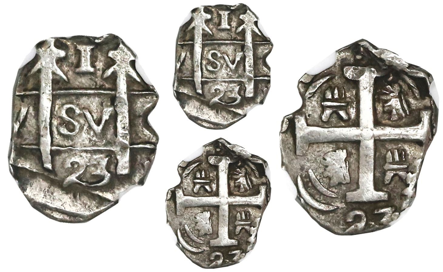 Leon, Nicaragua, provisional "imitation cob" 1 real, 1823-(PMPY), two-digit date, pine tree style, very rare, NGC MS 61, ex-Richard Stuart (stated on label). KM-8.1 (under Honduras). 2.91 grams. Very bold full pillars and cross, two dates, contrasting toning, somewhat crude edge (as made), second finest in NGC census behind an MS 62. Pedigreed to the Richard Stuart collection. NGC #4494791-002.