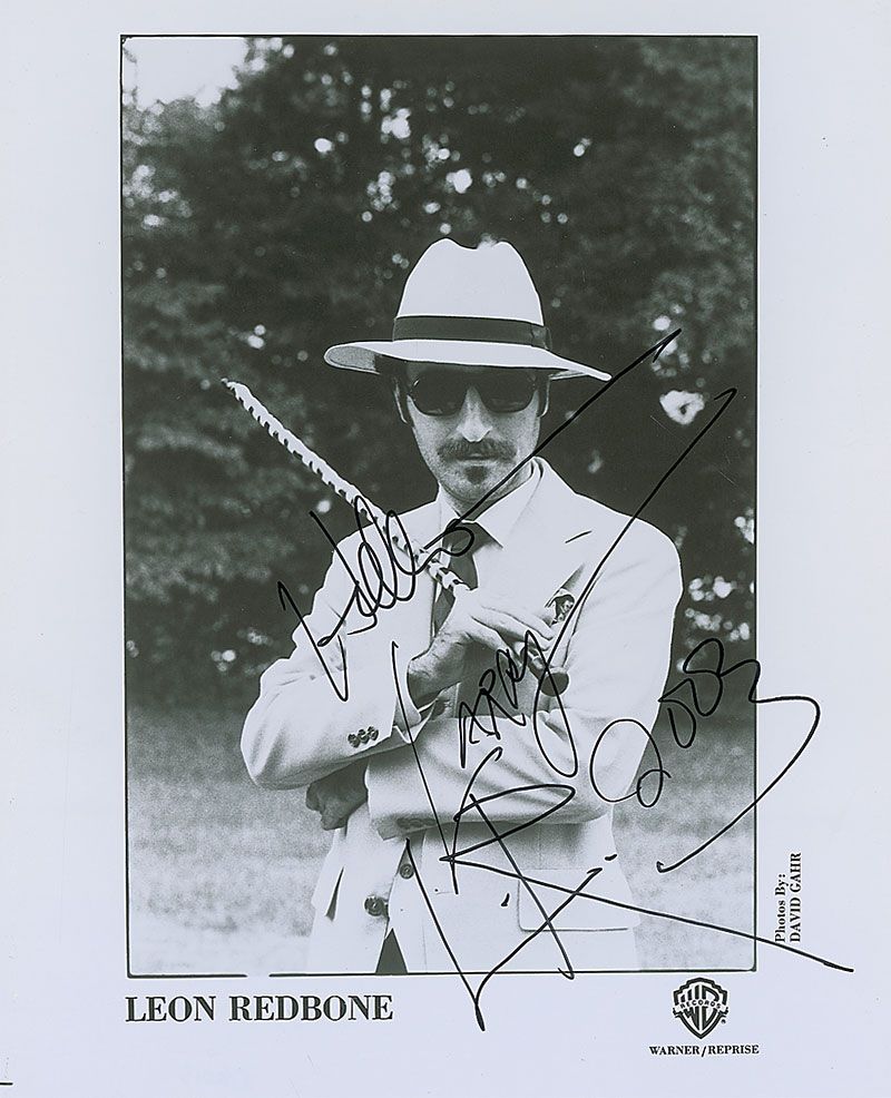 Glossy 8 x 10 Warner Bros. publicity photo, signed and inscribed in black felt tip, “Hello Larry—Leon Redbone 2003.” In fine condition.